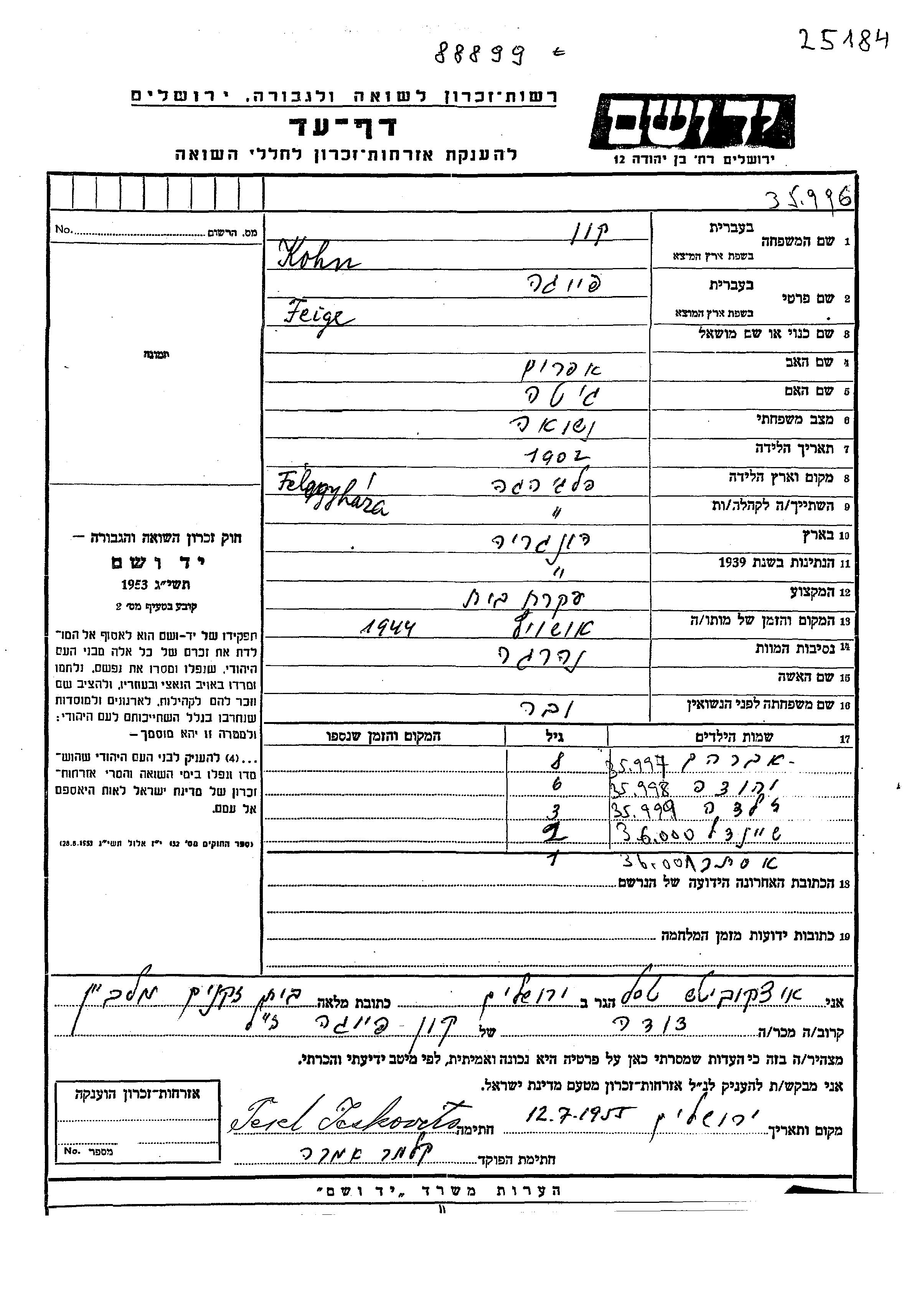Yehuda Kohn Kun wurde Er war der Sohn von Feiga, geb. Vaver. Er war Kind. Vor dem Zweiten Weltkrieg lebte er in Felegyhaza, Ungarn.