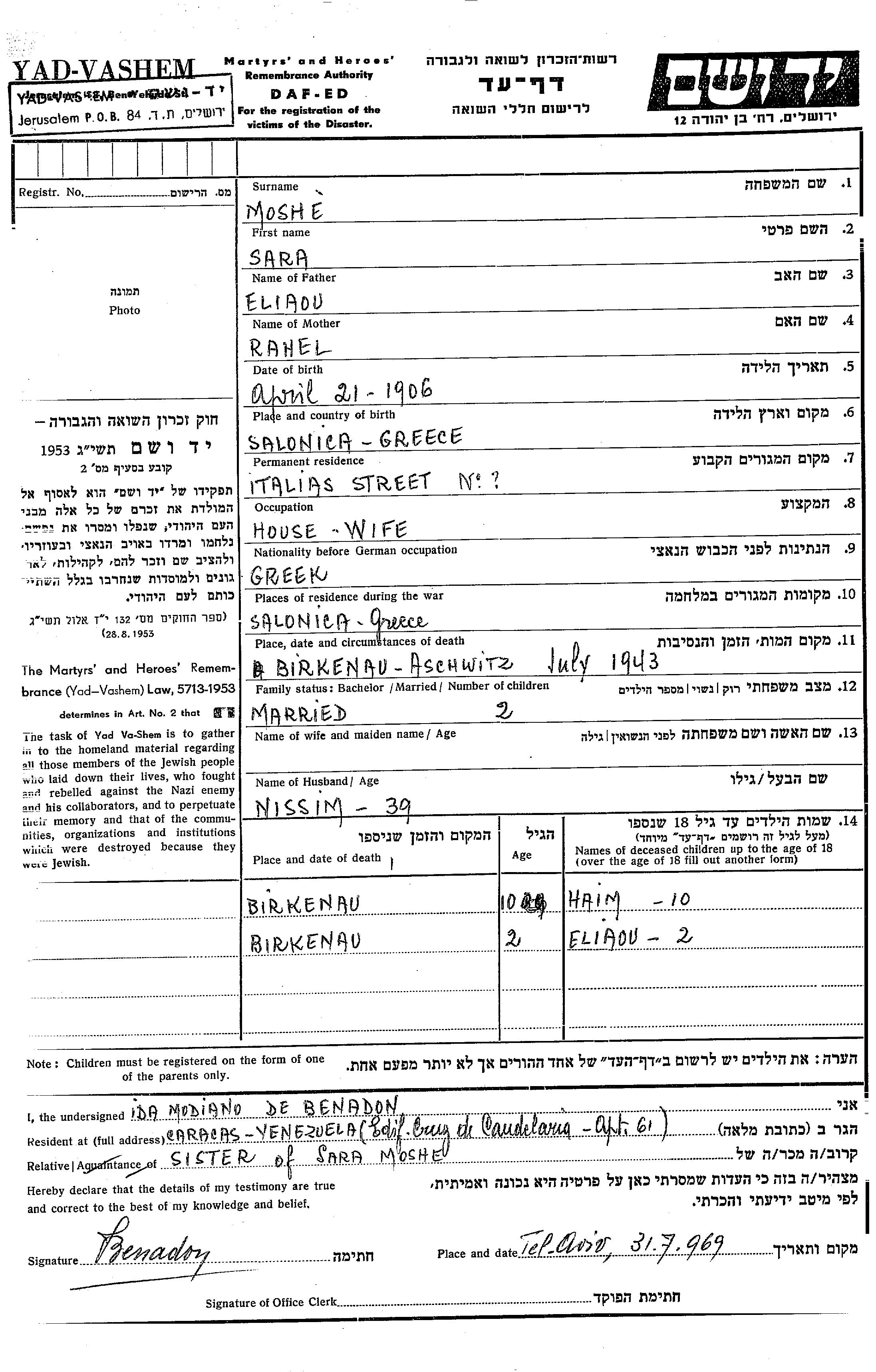 Haim Moshe wurde Er war der Sohn von Nissim und Sara. Er war Kind. Vor dem Zweiten Weltkrieg lebte er in Salonika, Griechenland. Während des Krieges war er in Salonika, Griechenland.