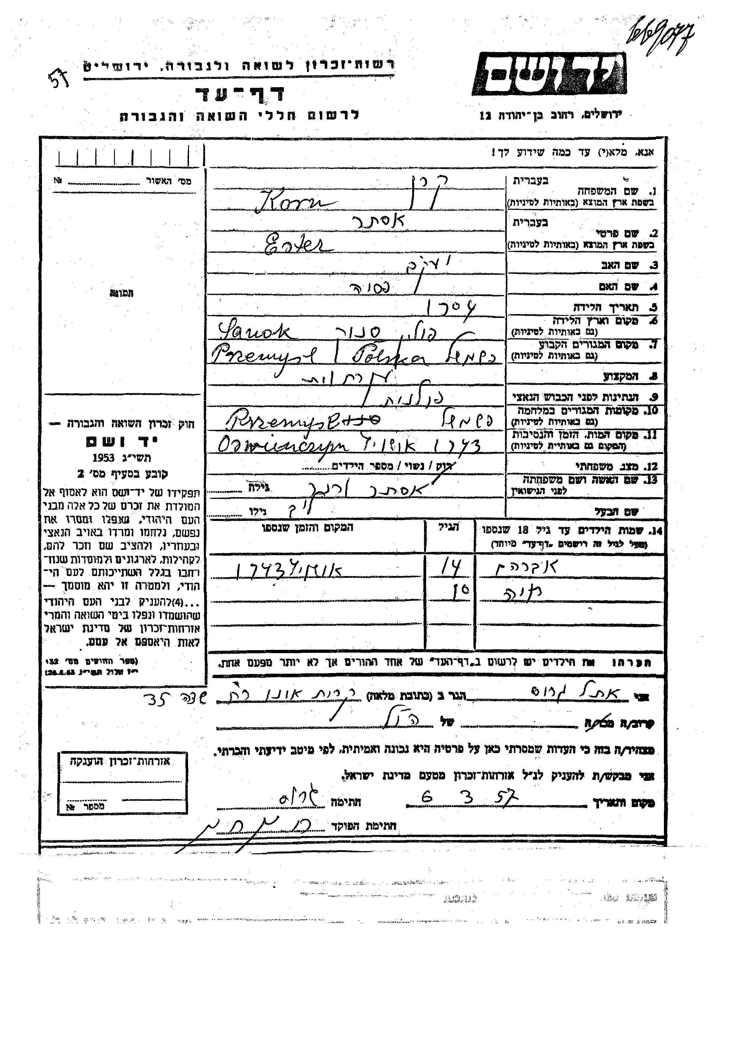 Khaia Korn Kern wurde Sie war die Tochter von Leib und Ester, geb. Verner. Sie war Kind. Vor dem Zweiten Weltkrieg lebte sie in Przemysl, Polen. Während des Krieges war sie in Przemysl, Polen.