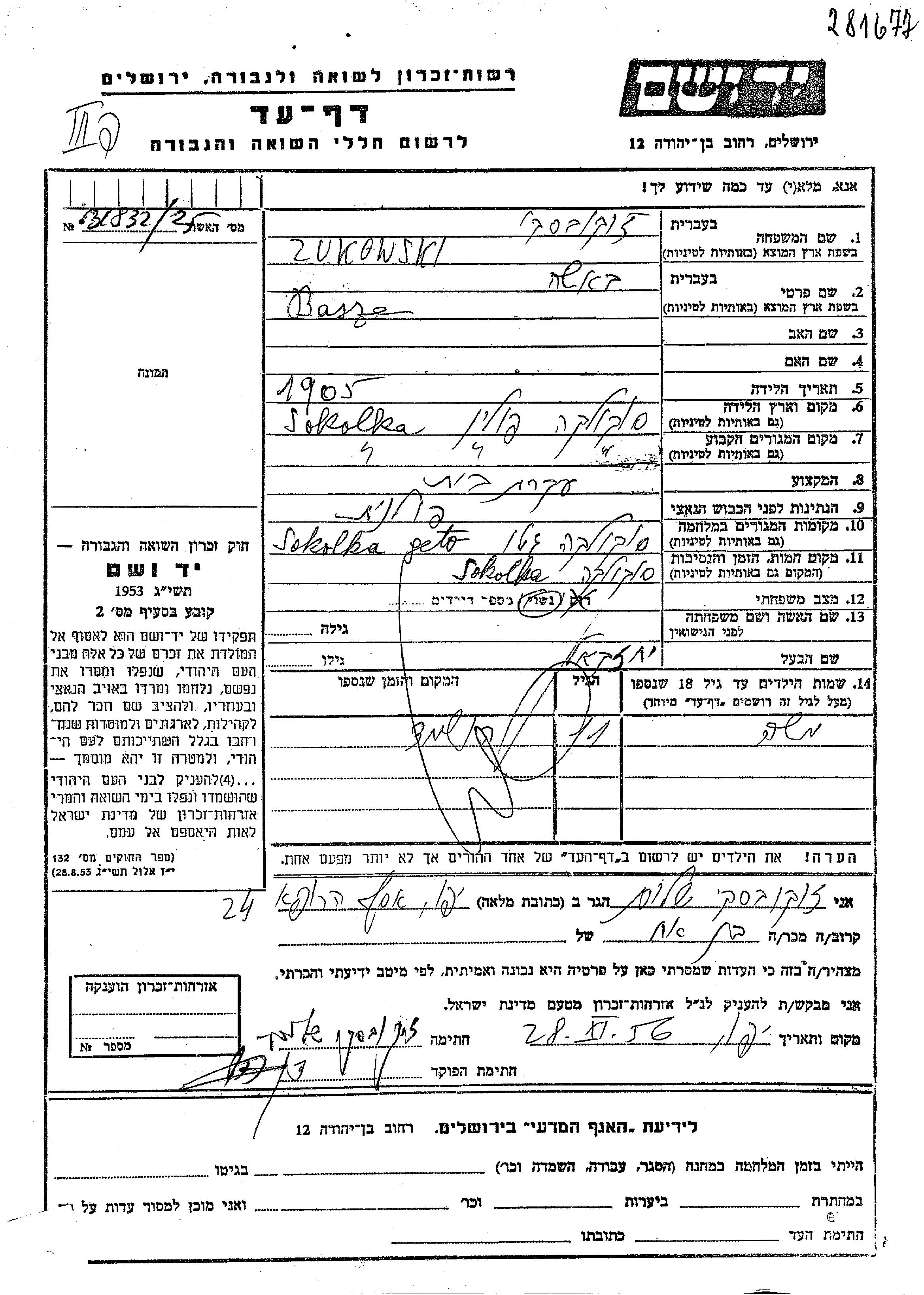 Moshe Zukowski wurde Er war der Sohn von Yekhezkel und Basza. Er war Kind. Vor dem Zweiten Weltkrieg lebte er in Sokolka, Polen. Während des Krieges war er in Sokolka, Polen.