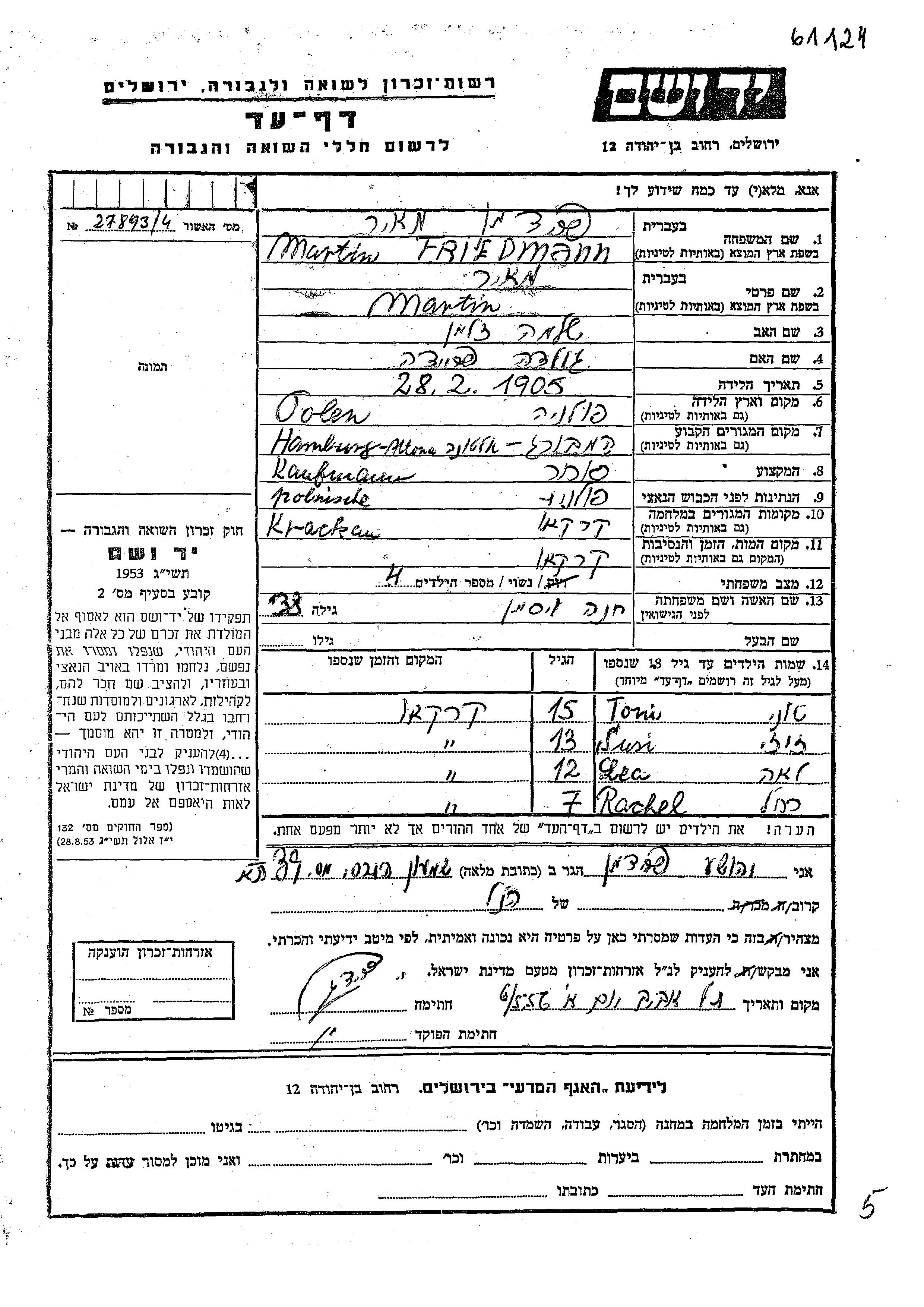 Rachel Friedmann wurde Sie war die Tochter von Martin Meir und Khana, geb. Visman. Sie war Kind. Vor dem Zweiten Weltkrieg lebte sie in Altona, Deutsches Reich. Während des Krieges war sie in Krakow, Polen.