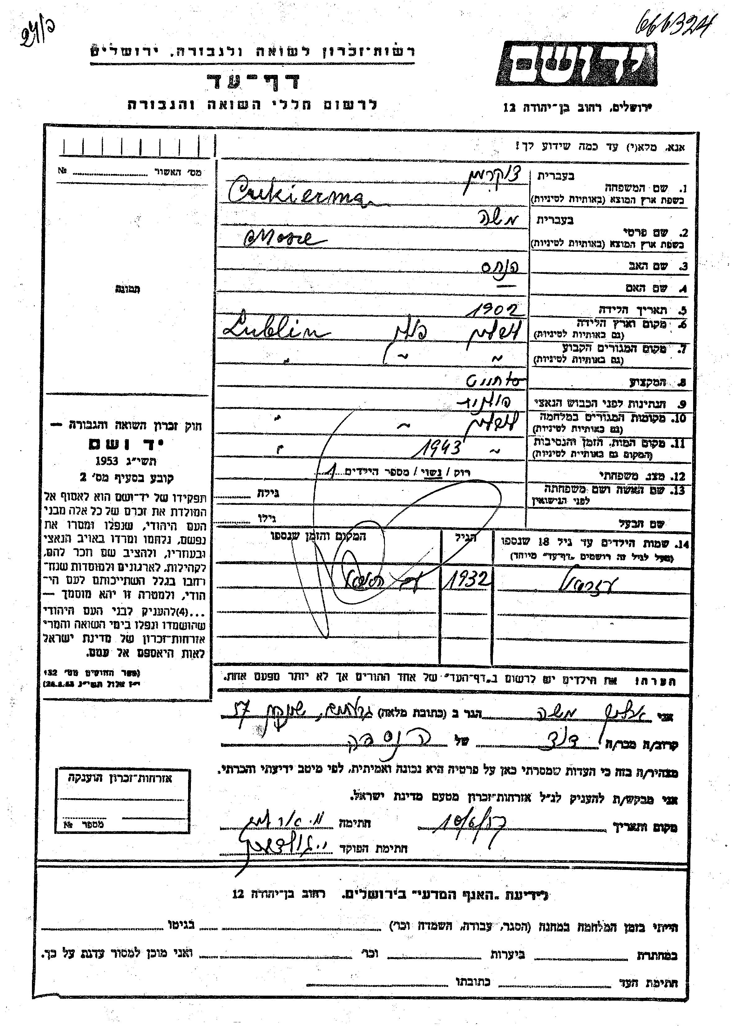 Cukierman Azriel 1932 Lublin, Polen Gedenkblatt