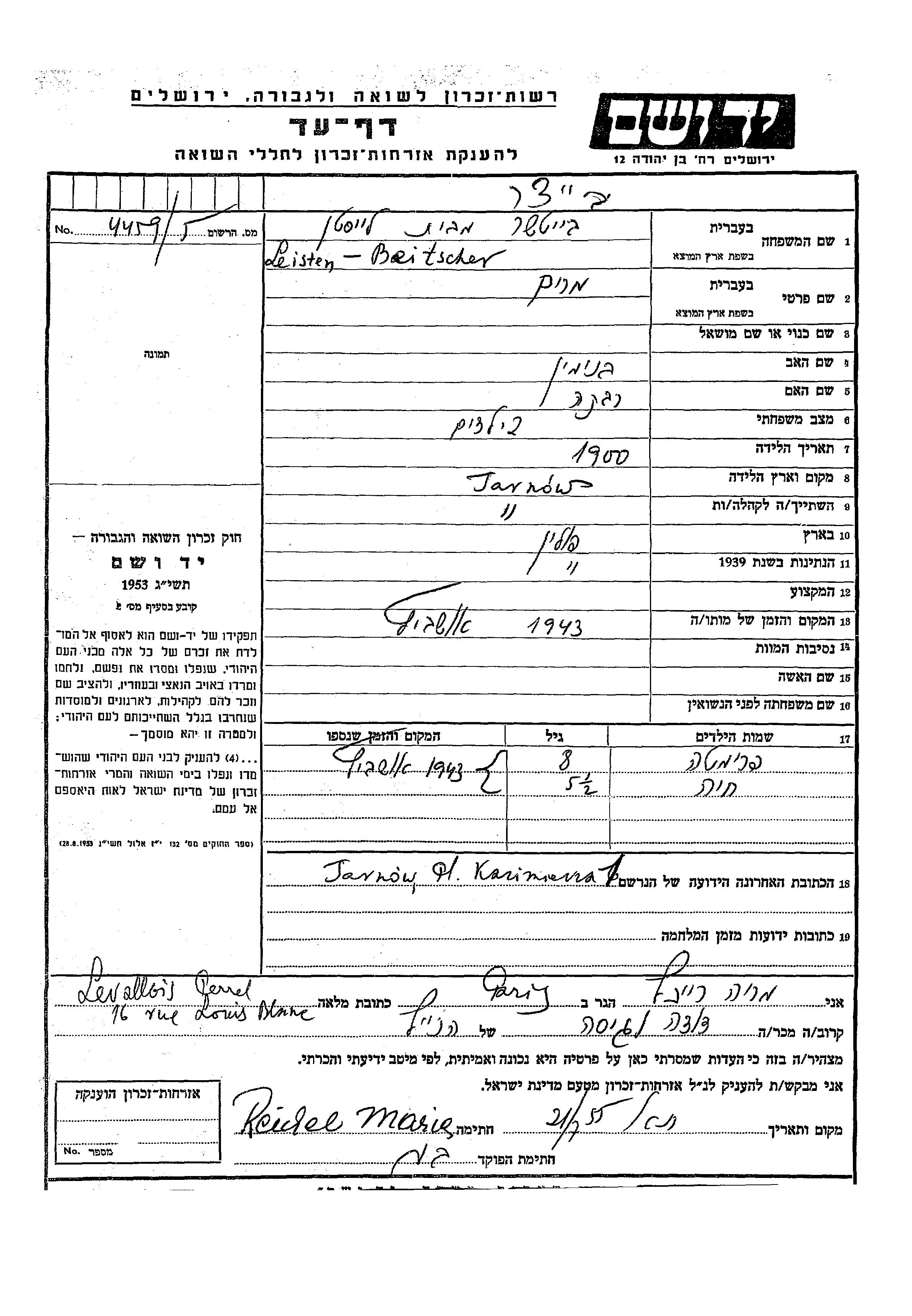 Frumet Beitscher wurde Sie war die Tochter von Miriam, geb. Leisten. Sie war Kind. Vor dem Zweiten Weltkrieg lebte sie in Tarnow, Polen. Während des Krieges war sie in Tarnow, Polen.
