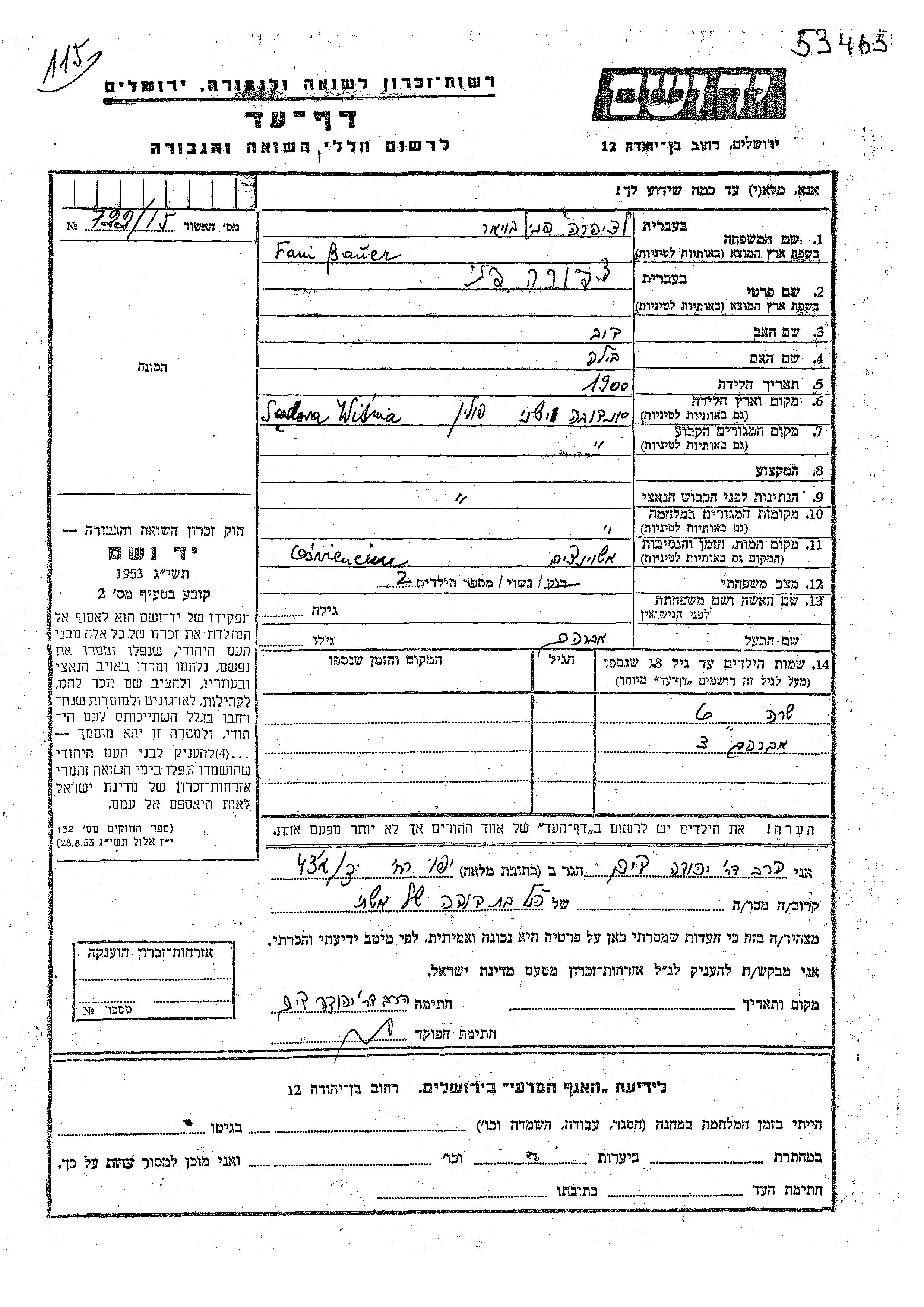 Tzipora Fani Bauer wurde im Jahr 1900 in Sandove Vishnie, Polen geboren. Sie war die Tochter von Dov und Bila. Sie war mit Avraham Verheiratet. Vor dem Zweiten Weltkrieg lebte sie in Sandove Vishnie, Polen. Während des Krieges war sie in Sandove Vishnie, Polen.