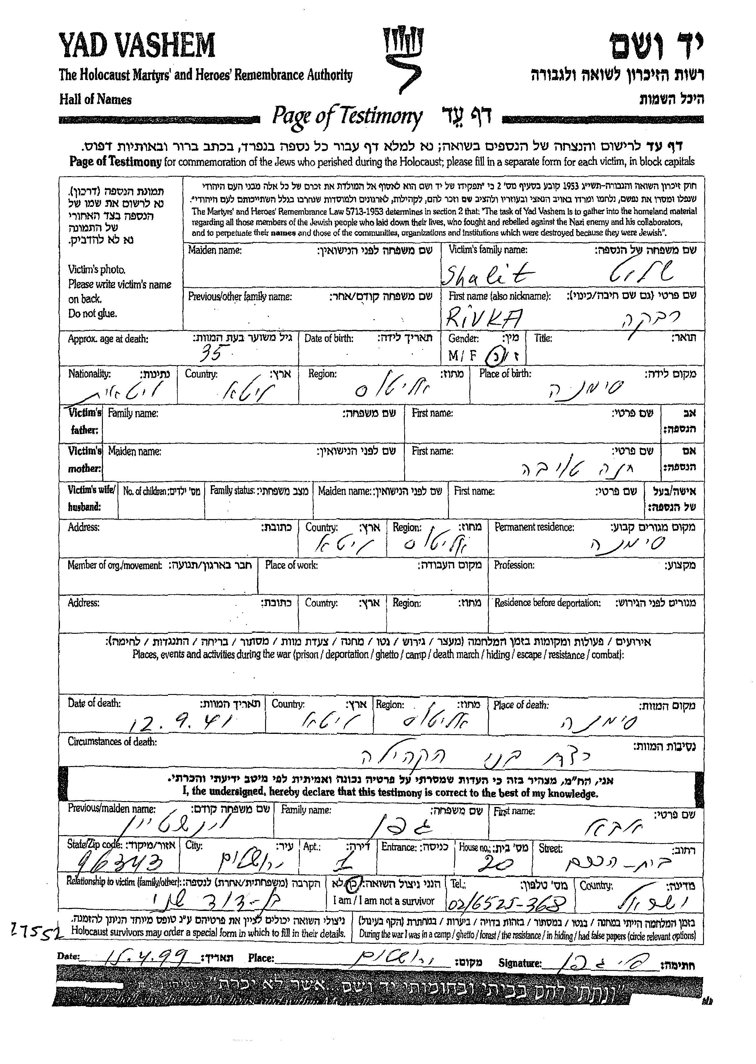 Rivka wurde in der Schoah ermordet. Todesort: Simna, Litauen im Jahr 12/09/1941.