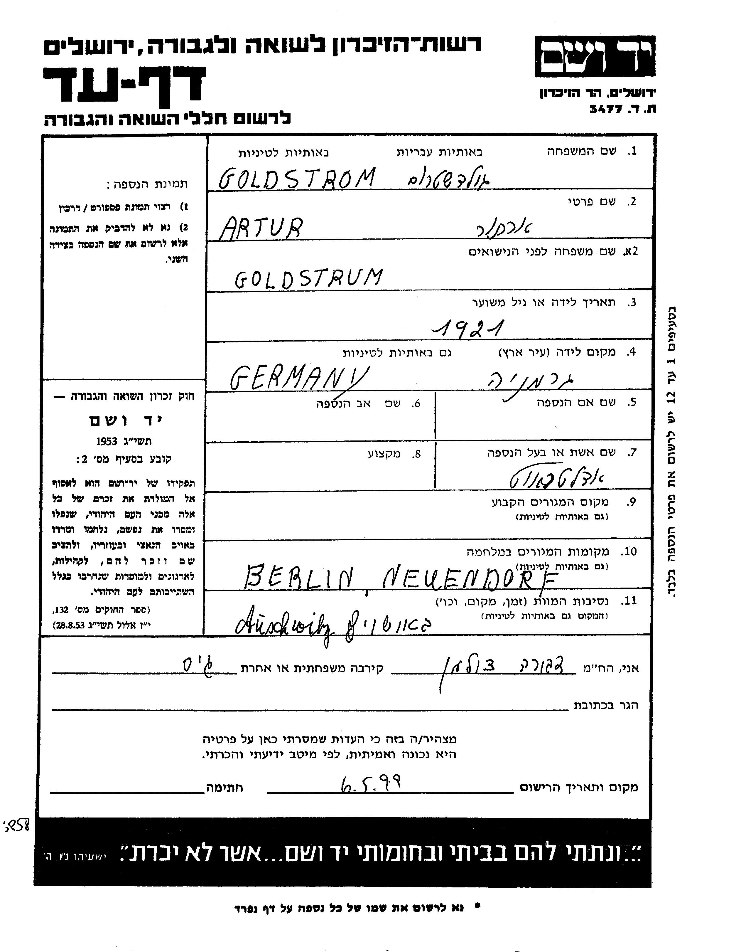Artur Goldstrom wurde im Jahr 1921 in Deutsches Reich geboren. Er war Verheiratet. Während des Krieges war er in Neuendorf, Deutsches Reich.