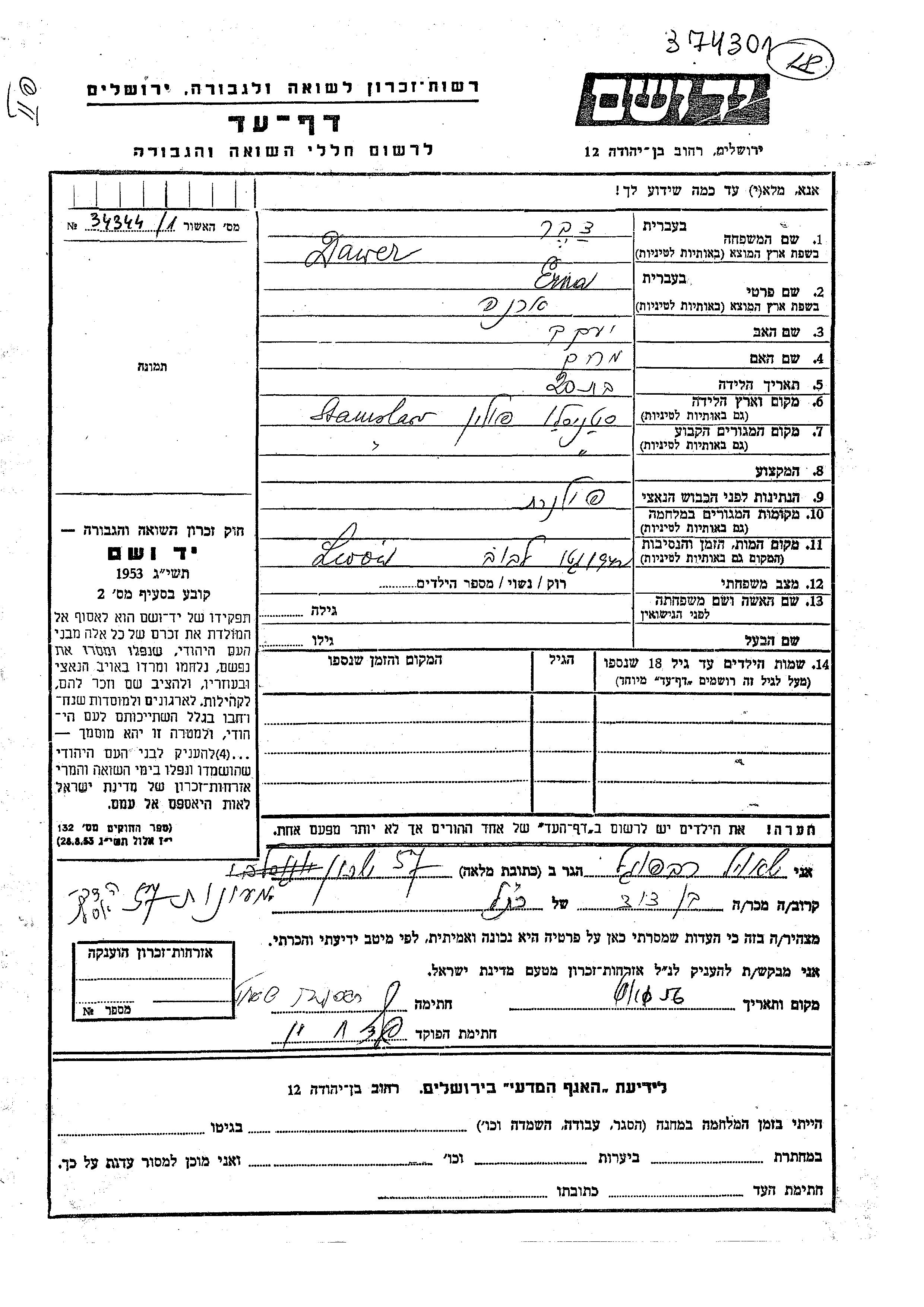 Erna Dawer wurde in Stanislaw, Polen geboren. Sie war die Tochter von Yaakov und Miriam. Vor dem Zweiten Weltkrieg lebte sie in Stanislaw, Polen.