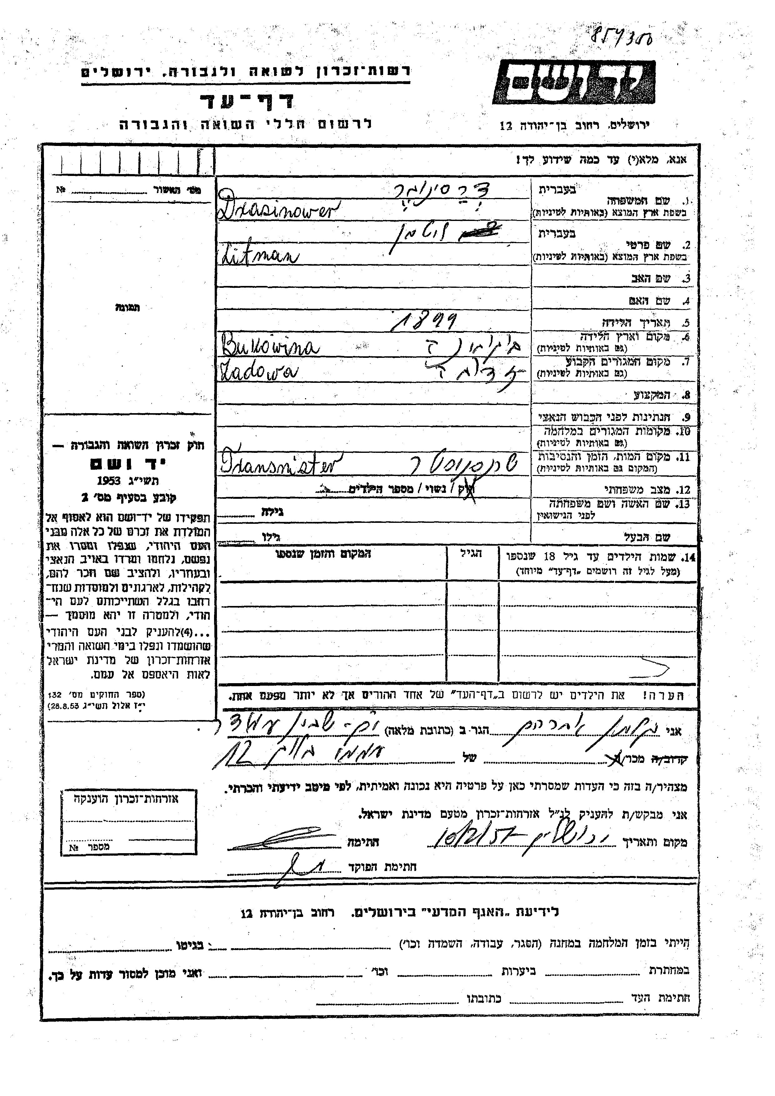 Litman Drasinower wurde im Jahr 1899 in Bukovina, Rumänien geboren. Er war Verheiratet. Vor dem Zweiten Weltkrieg lebte er in Zadowa, Rumänien.