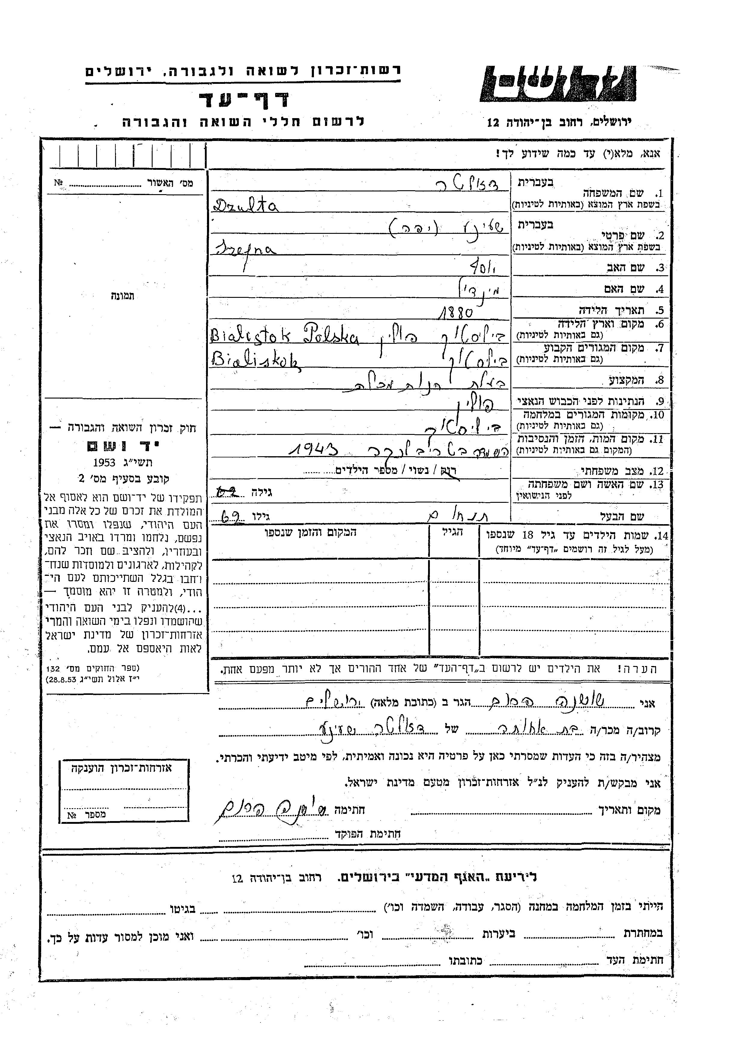 Szejna Yafa Dzulta wurde im Jahr 1880 in Bialistok, Polen geboren. Sie war die Tochter von Yosef und Mindil. Sie war Besitzer/-in eines lebensmittelgeschäfts und mit Tankhum Verheiratet. Vor dem Zweiten Weltkrieg lebte sie in Bialistok, Polen. Während des Krieges war sie in Bialistok, Polen.
