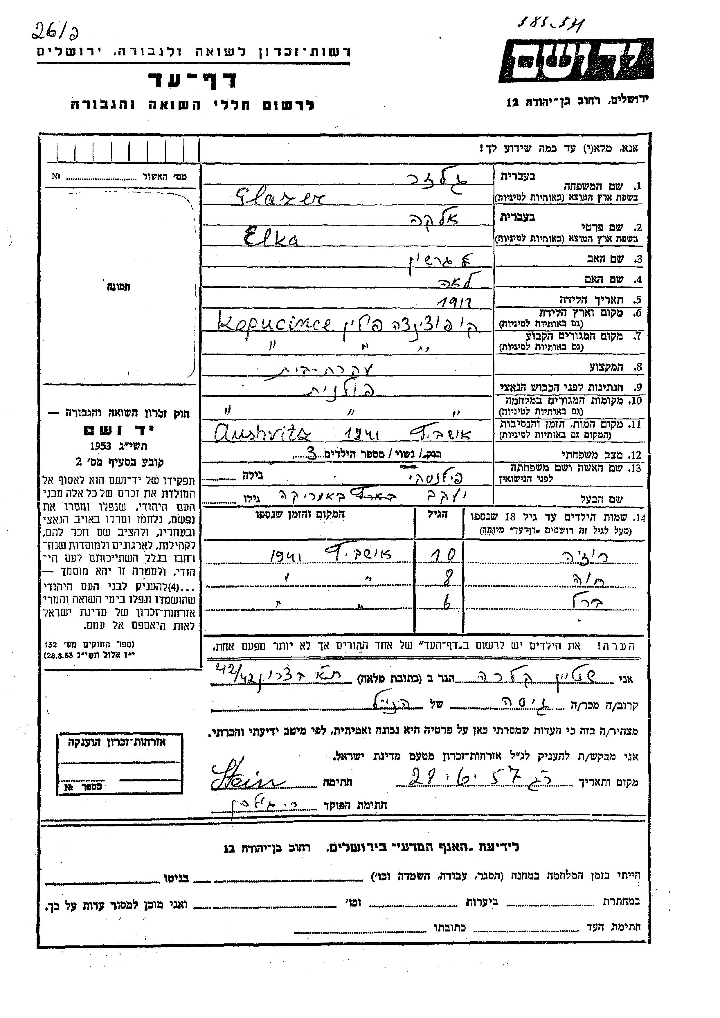 Berl Glazer wurde Er war der Sohn von Yaakov und Elka, geb. Pilanski. Er war Kind. Vor dem Zweiten Weltkrieg lebte er in Kopoczynce, Polen. Während des Krieges war er in Kopoczynce, Polen.