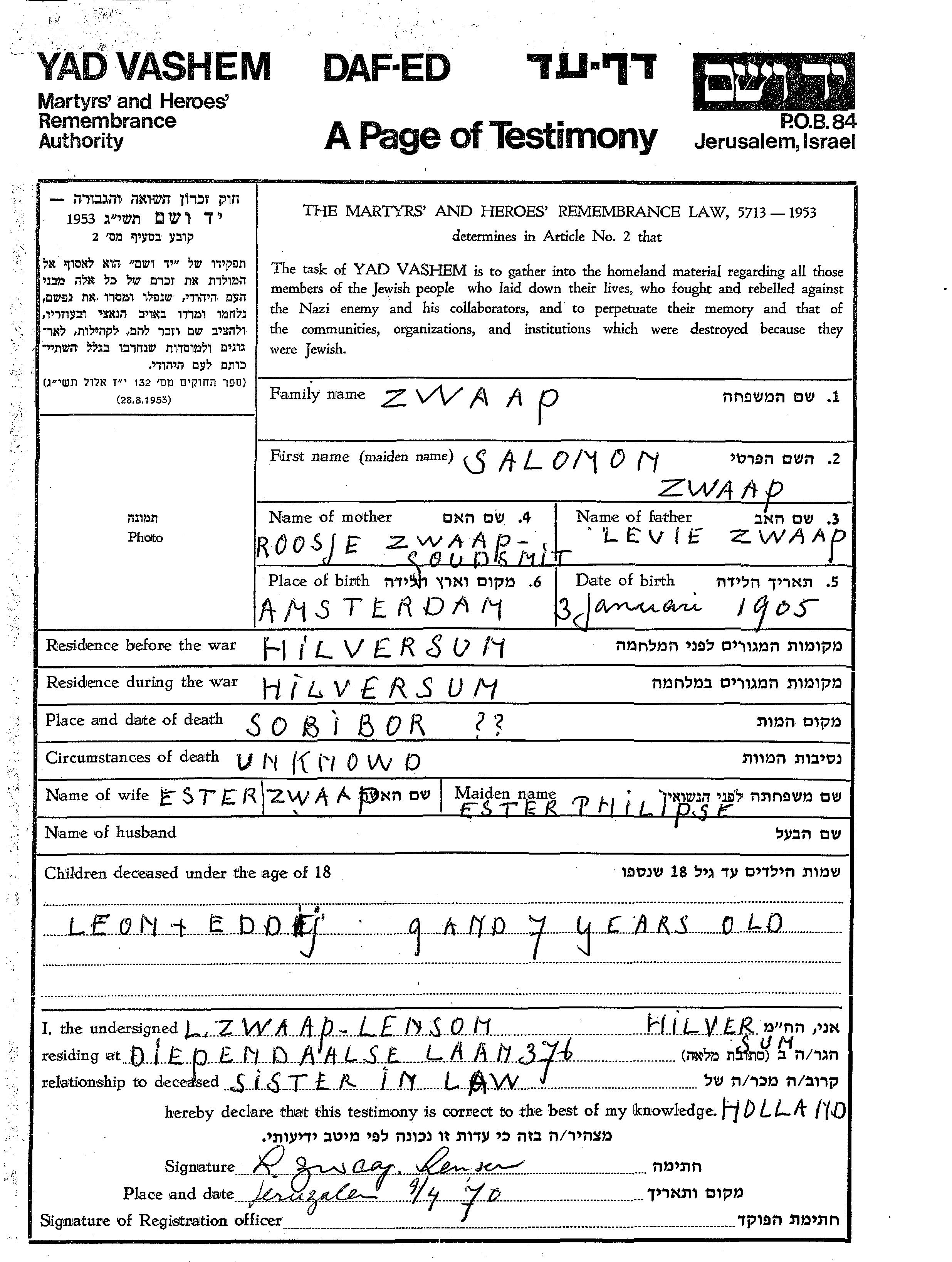 Leon Zwaap wurde Er war der Sohn von Salomon und Ester, geb. Philips. Er war Kind. Vor dem Zweiten Weltkrieg lebte er in Hilversum, Niederlande. Während des Krieges war er in Hilversum, Niederlande.