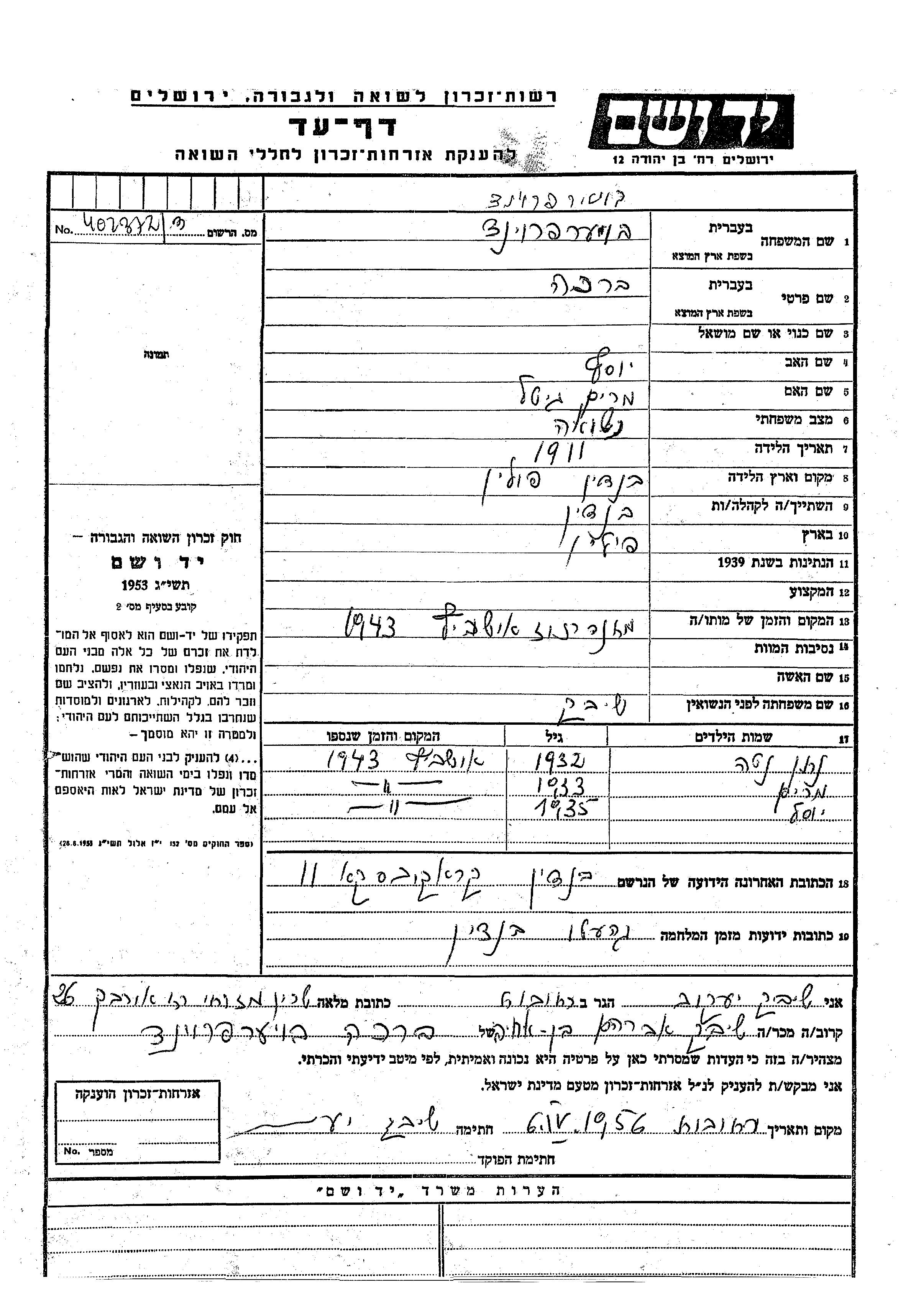 Yosel Borenfroind wurde im Jahr 1935 geboren. Er war der Sohn von Brakha, geb. Shibek. Er war Kind. Vor dem Zweiten Weltkrieg lebte er in Polen. Während des Krieges war er in Będzin, Polen.