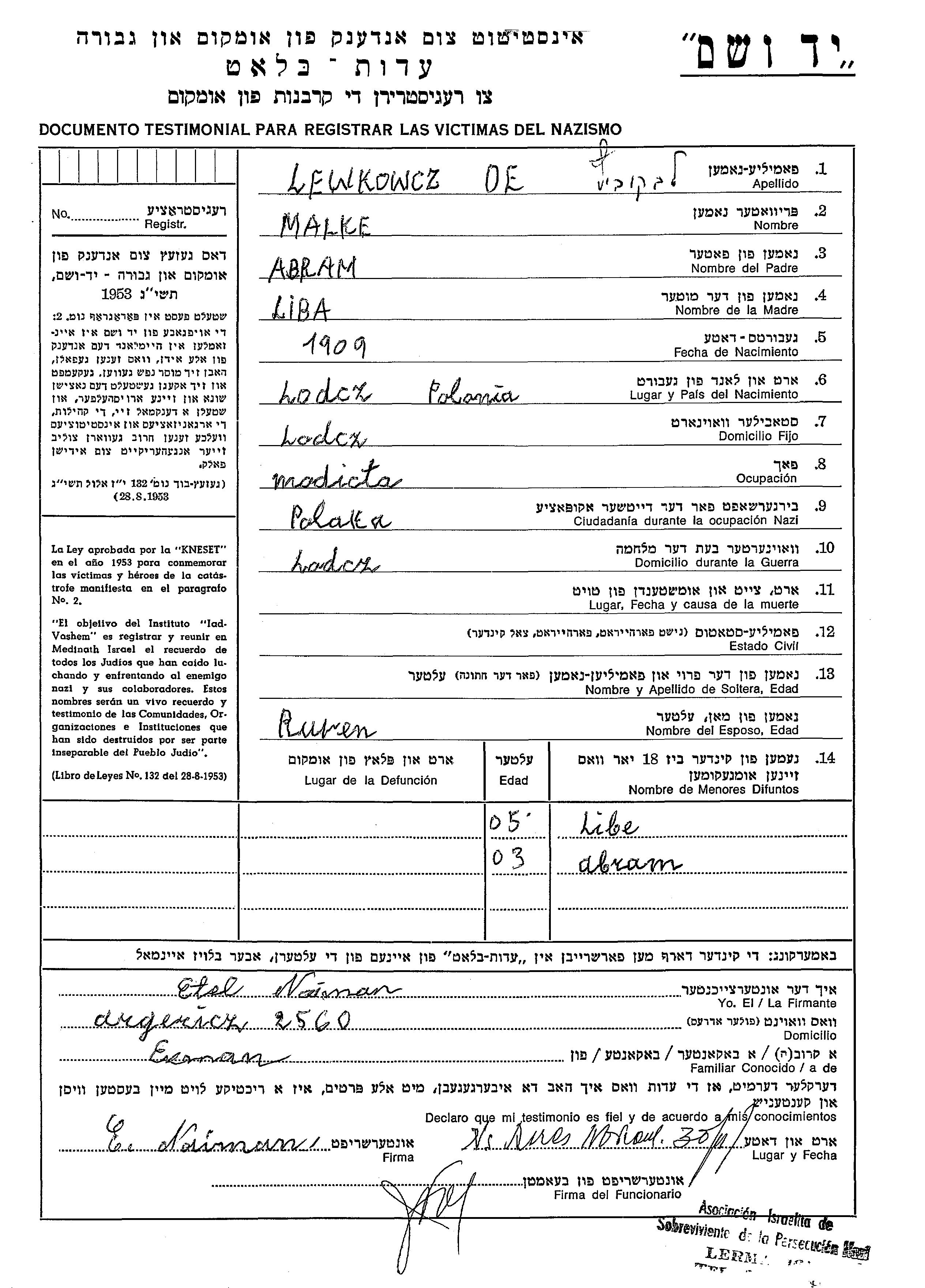 Abram Lewkowcz wurde Er war der Sohn von Ruven und Malke. Er war Kind. Vor dem Zweiten Weltkrieg lebte er in Lodz, Polen. Während des Krieges war er in Lodz, Polen.
