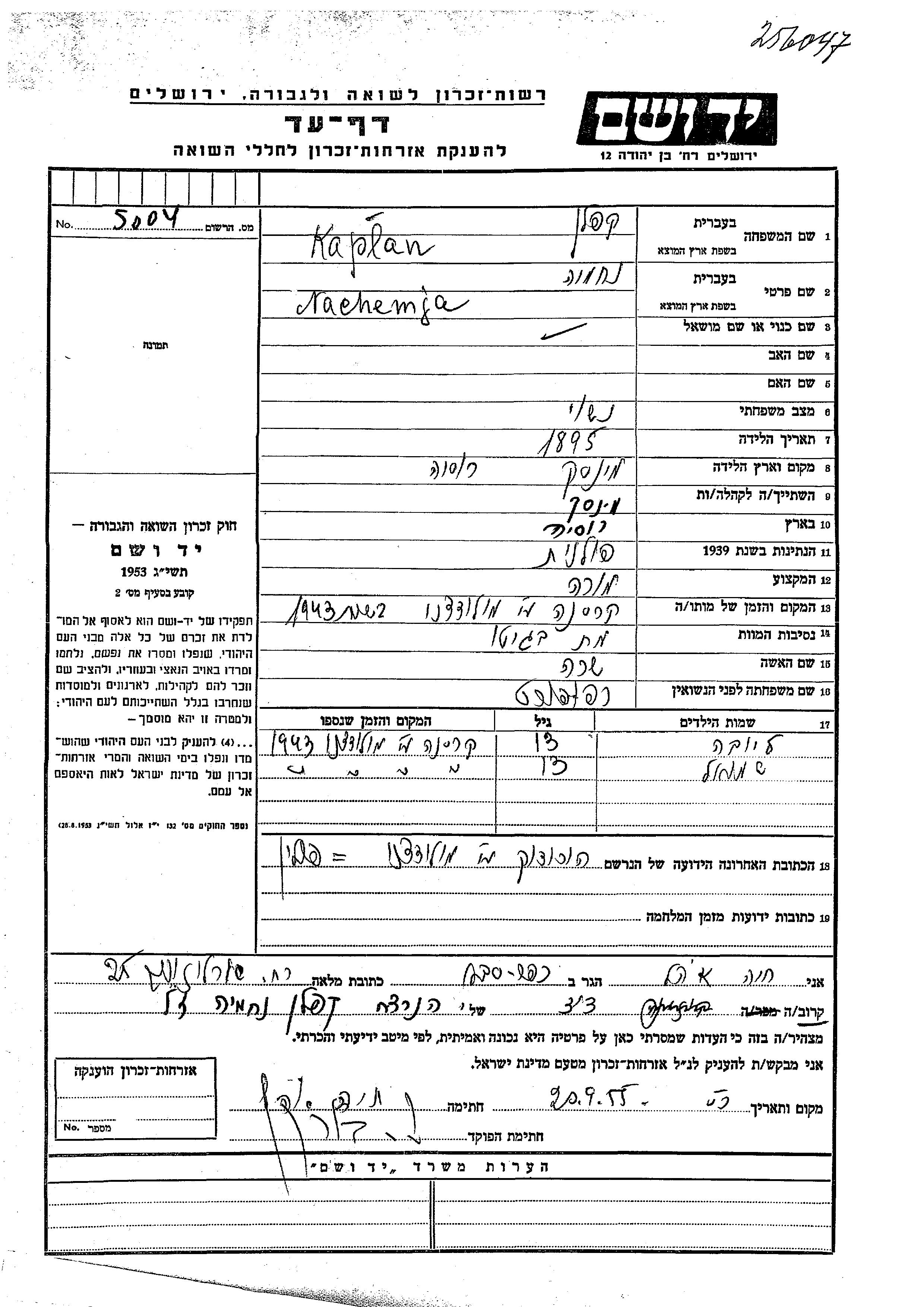 Shmuel Kaplan wurde Er war der Sohn von Nachemja und Sara, geb. Rapoport. Er war Kind. Vor dem Zweiten Weltkrieg lebte er in Minsk, Weißrussland (UdSSR). Während des Krieges war er in Horodok, Polen.