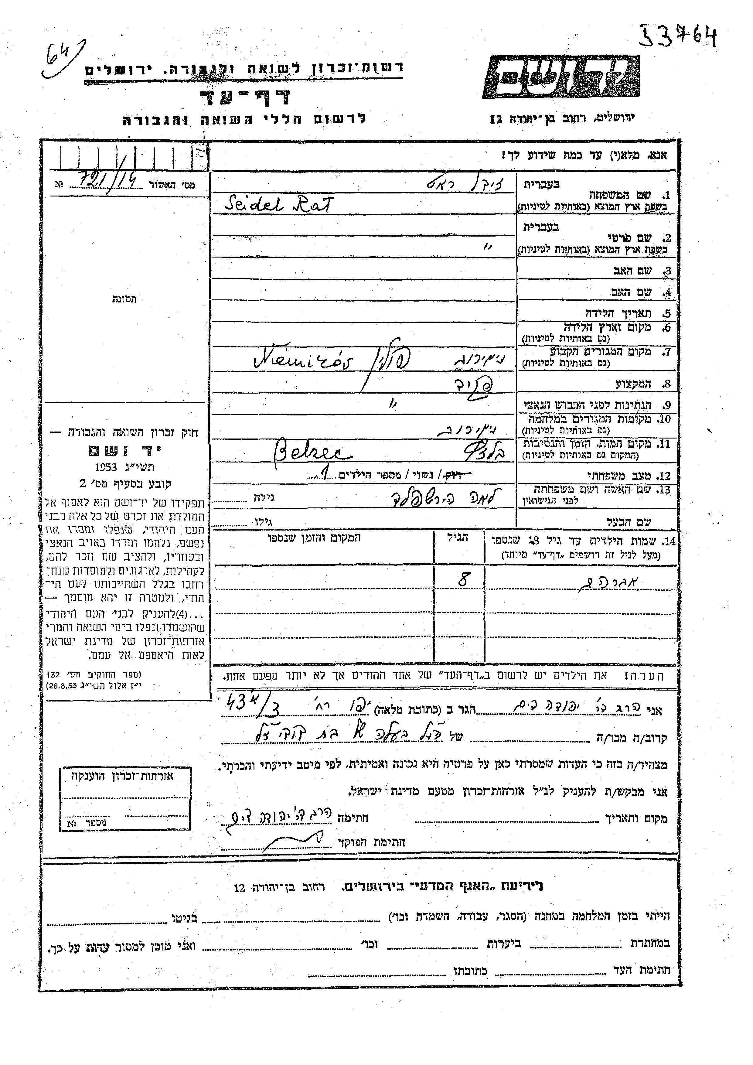 Avraham Rat wurde Er war der Sohn von Zeide und Lea, geb. Hirshfeld. Er war Kind. Vor dem Zweiten Weltkrieg lebte er in Polen. Während des Krieges war er in Niemirov, Polen.