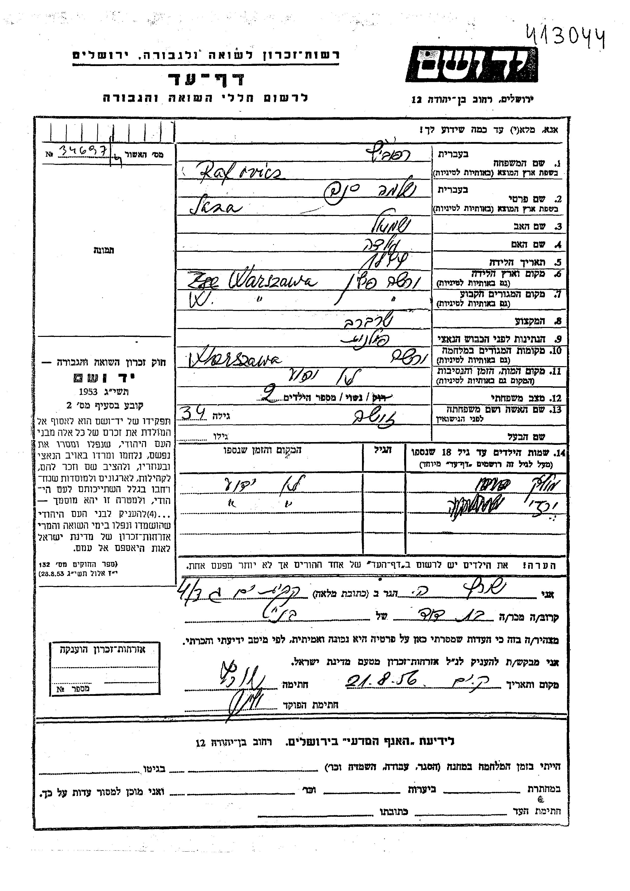 Irzhi Rafovicz wurde Er war der Sohn von Shlomo Sana und Zisha. Er war Kind. Vor dem Zweiten Weltkrieg lebte er in Warsaw, Polen. Während des Krieges war er in Warsaw, Polen.