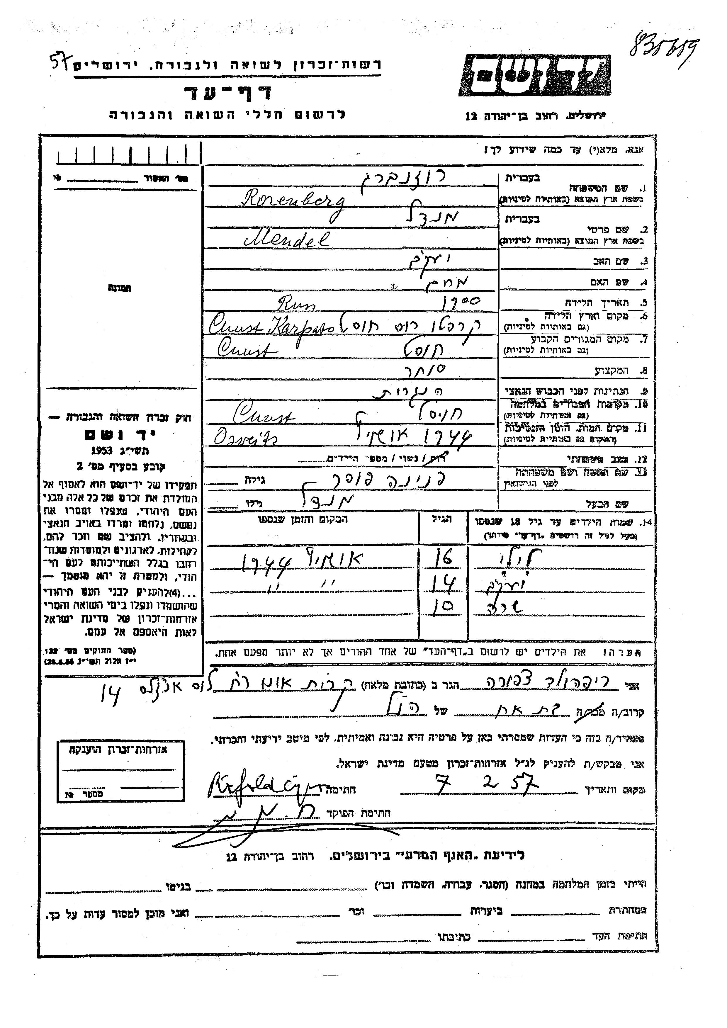 Yaakov Rosenberg wurde Er war der Sohn von Mendel und Pnina, geb. Fokher. Er war Kind. Vor dem Zweiten Weltkrieg lebte er in Chust, Tschechoslowakei. Während des Krieges war er in Chust, Tschechoslowakei.