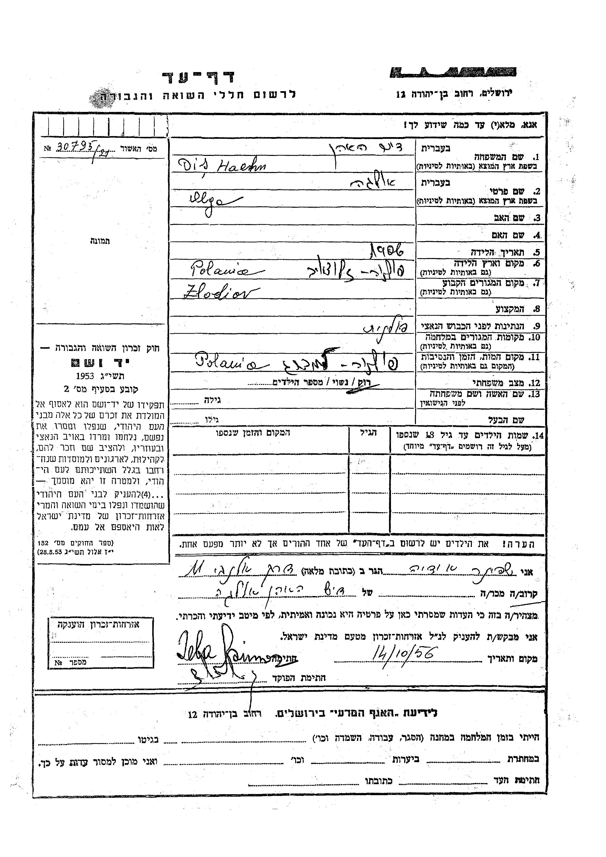 Olga Dis Dis Hahn Han wurde im Jahr 1906 in Zloczow, Polen geboren. Sie war Ledig. Vor dem Zweiten Weltkrieg lebte sie in Zlochev, Polen.