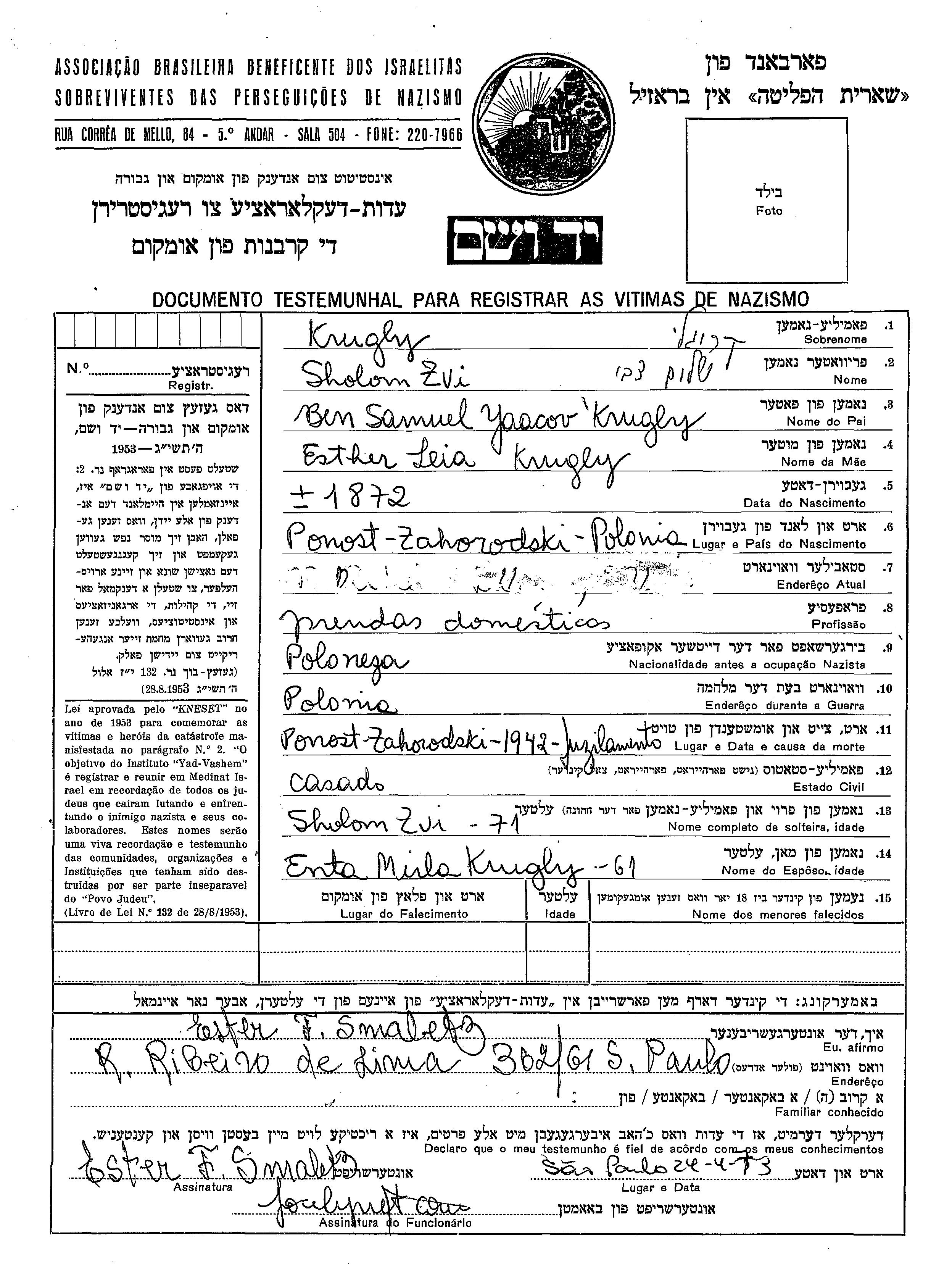 Sholom Zvi Krugly wurde im Jahr 1872 in Pohost Zagorodski, Polen geboren. Er war der Sohn von Yaacov Samuel und Esther Leia. Er war Prendas domesticas und mit Enta Mirla Verheiratet. Vor dem Zweiten Weltkrieg lebte er in Pohost Zagorodski, Polen. Während des Krieges war er in Polen.