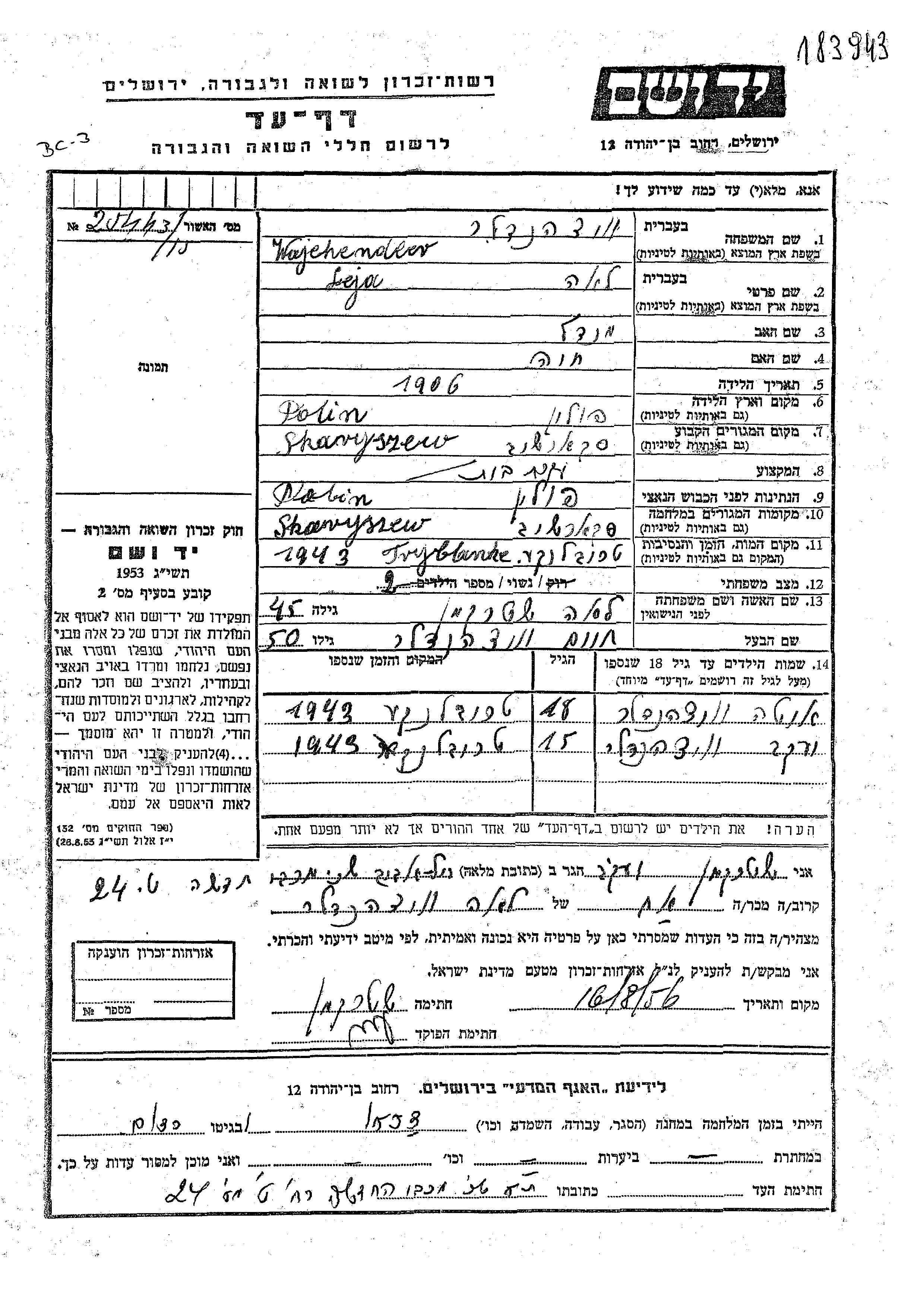 Yaakov Wajchendler wurde Er war der Sohn von Khaim und Leja, geb. Shtarkman. Er war Kind. Vor dem Zweiten Weltkrieg lebte er in Skaryszew, Polen. Während des Krieges war er in Skaryszew, Polen.