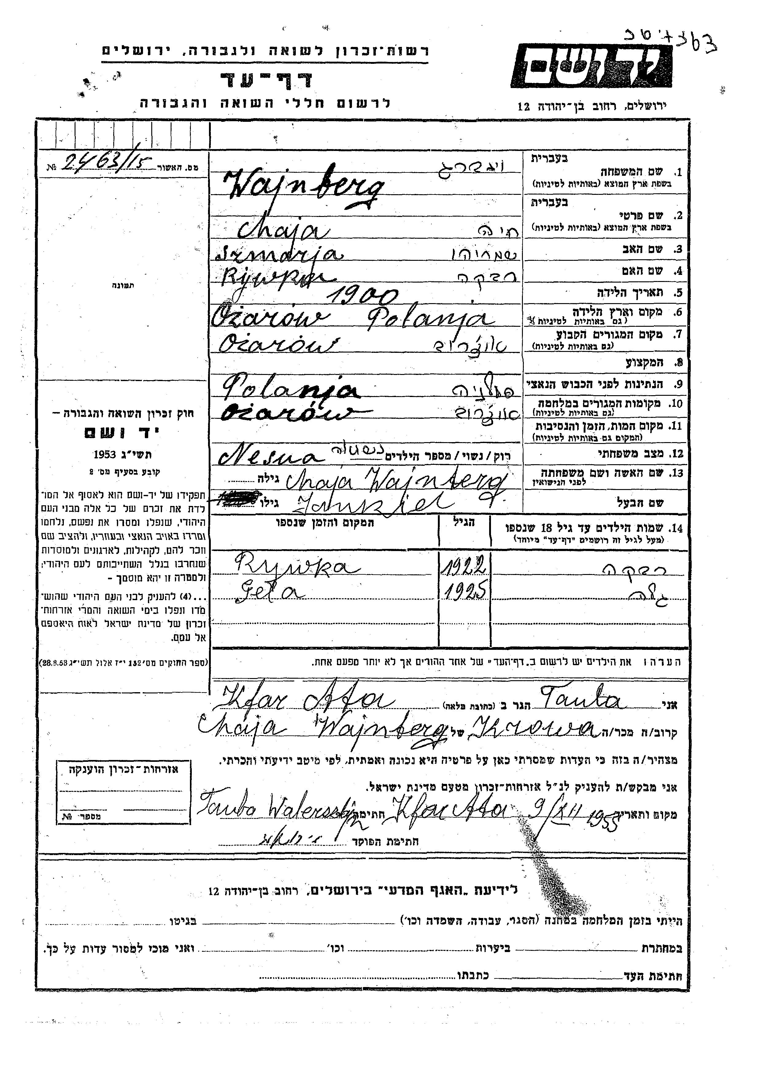 Gela Wajnberg wurde im Jahr 1925 geboren. Sie war die Tochter von Jankiel und Chaja. Sie war Kind. Vor dem Zweiten Weltkrieg lebte sie in Ozarow, Polen. Während des Krieges war sie in Ozarow, Polen.