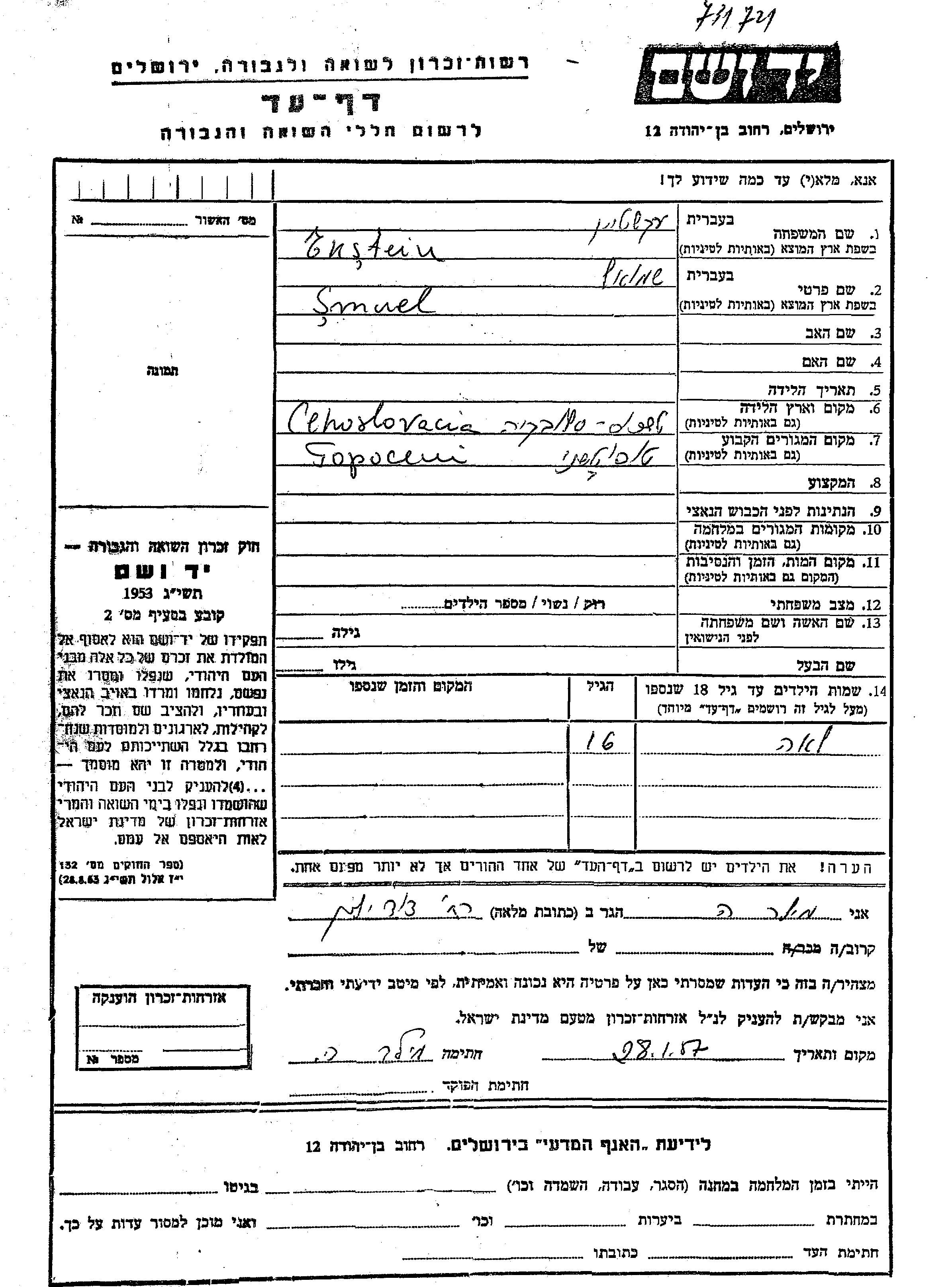 Ekstein Lea Topocani, Tschechoslowakei Gedenkblatt