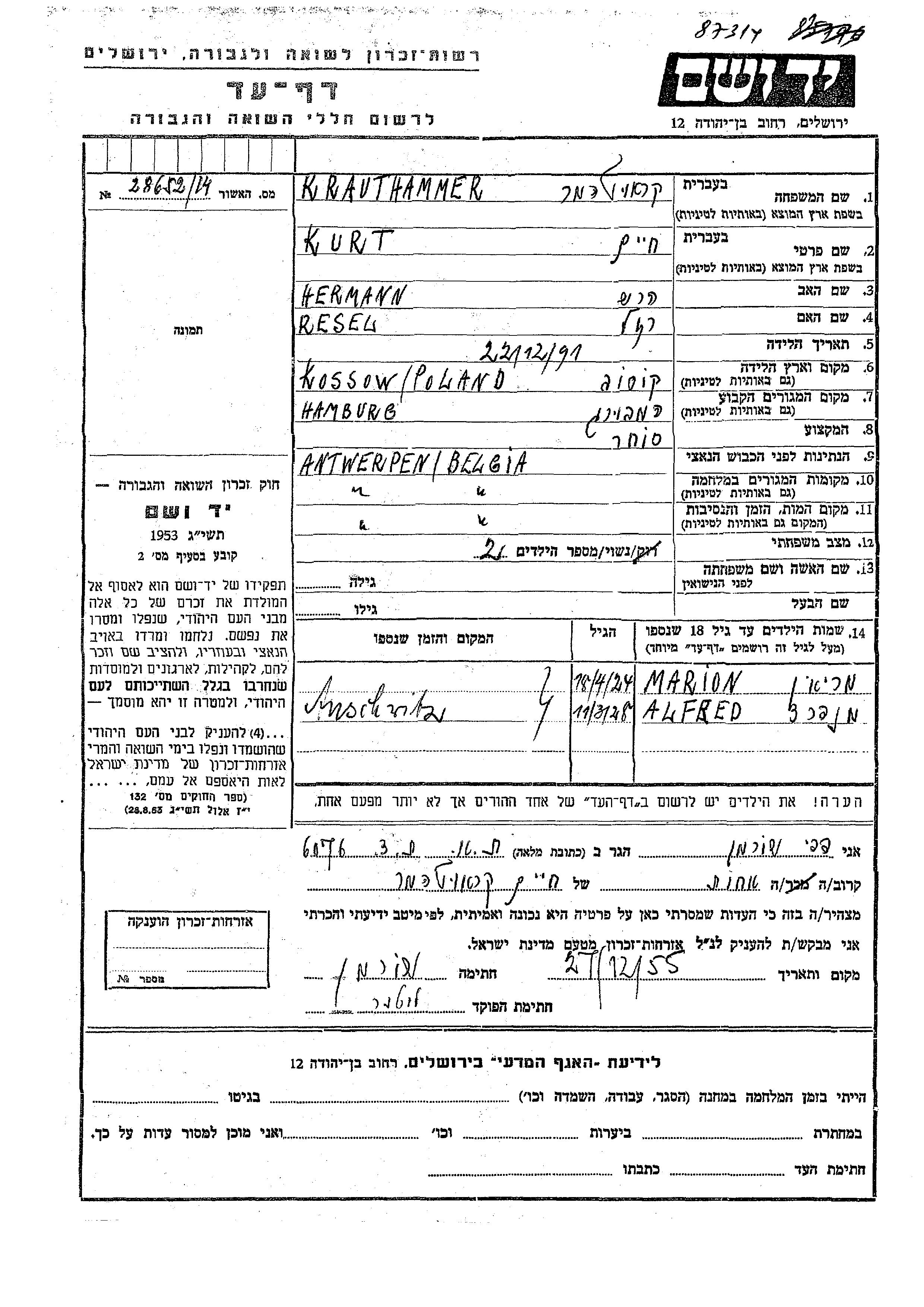 Alfred Manfred Krauthammer wurde im Jahr 1928 geboren. Er war der Sohn von Kurt Khaim. Er war Kind. Vor dem Zweiten Weltkrieg lebte er in Hamburg, Deutsches Reich. Während des Krieges war er in Antwerpen, Belgien.