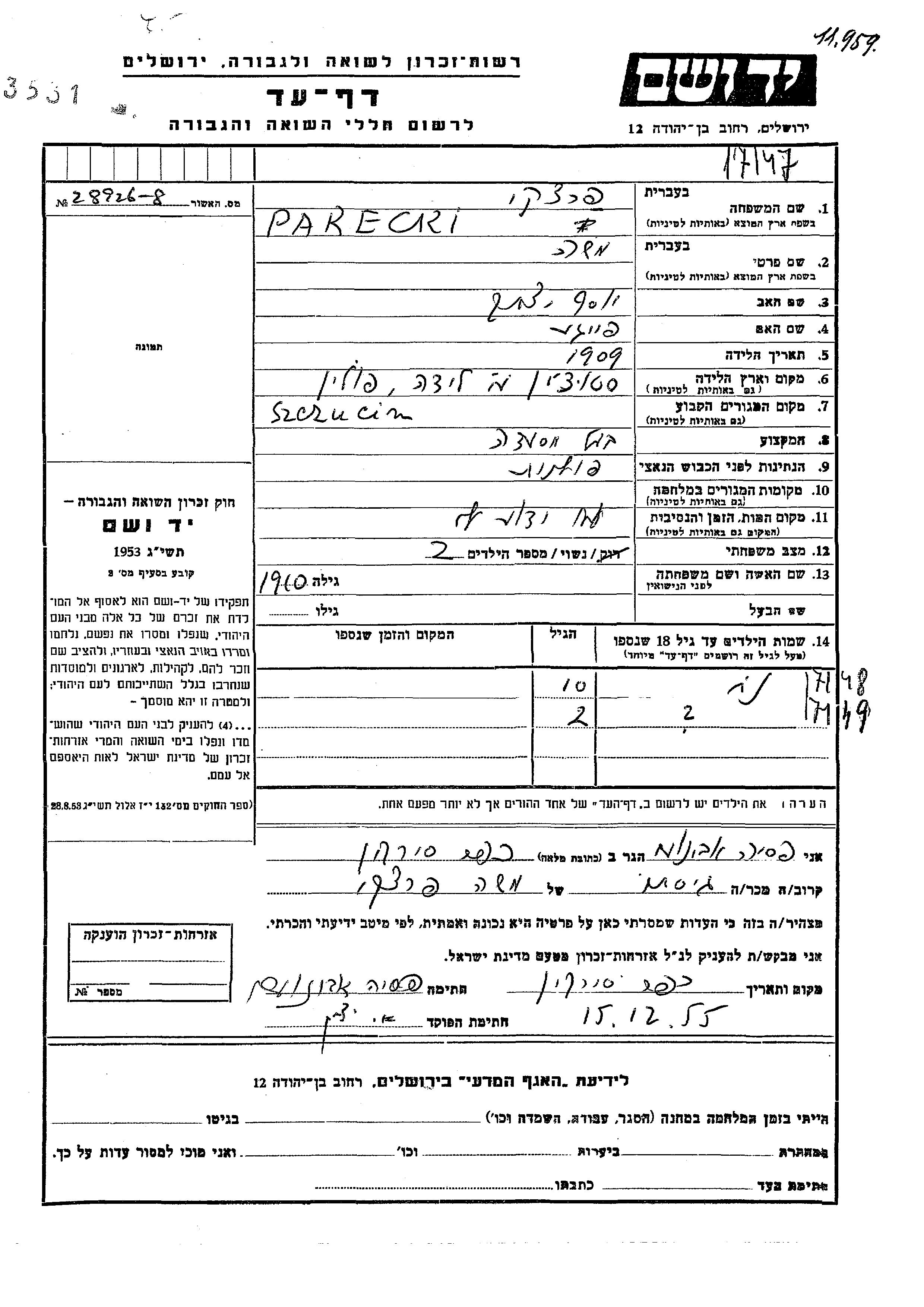 Vorname unbekannt Parecki wurde Er/sie war der/ die Sohn/Tochter von Moshe. Er/Sie war Kind. Vor dem Zweiten Weltkrieg er/sie in Szczucin, Polen.