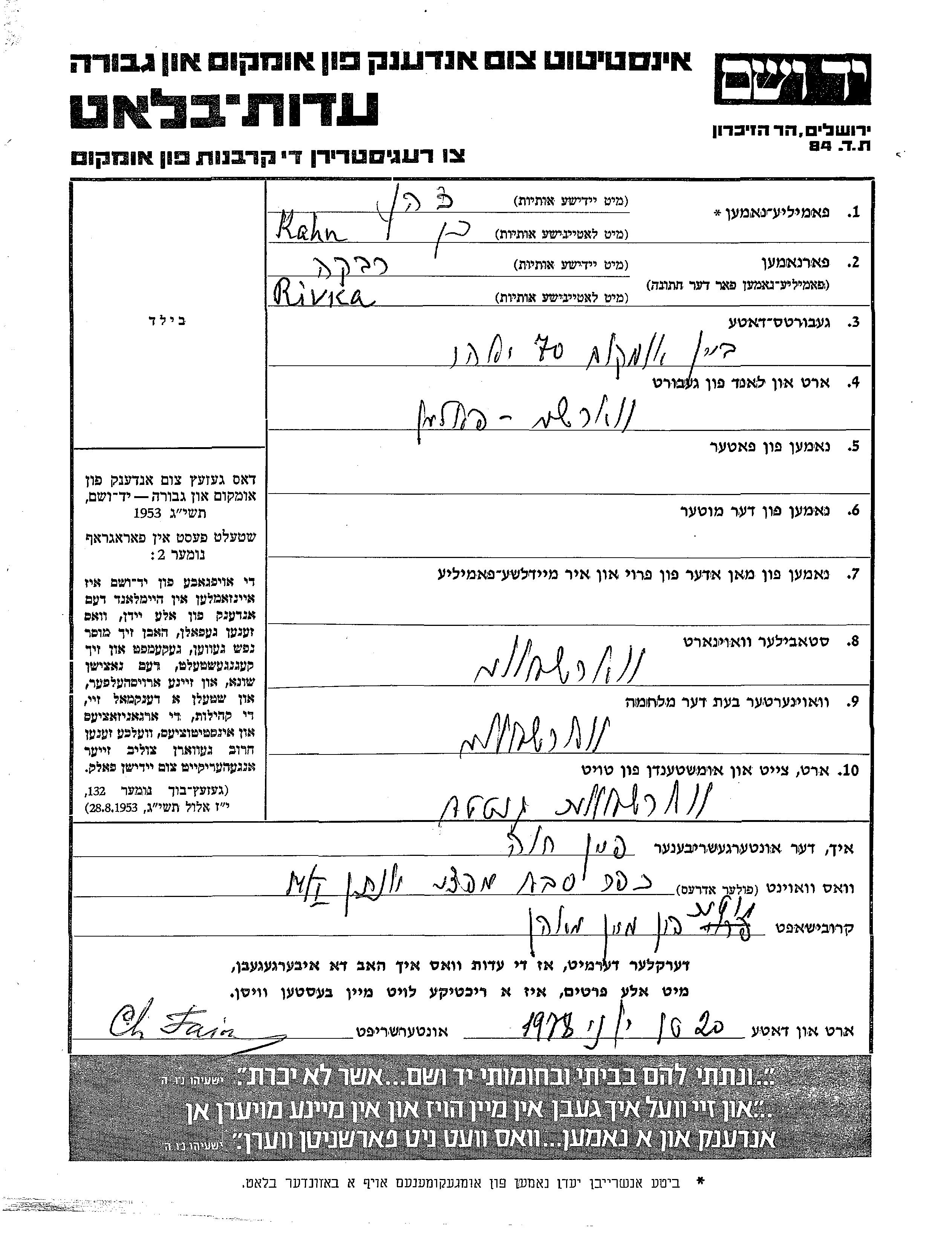Kahn Kohen Rivka Warszawa, Polen Gedenkblatt
