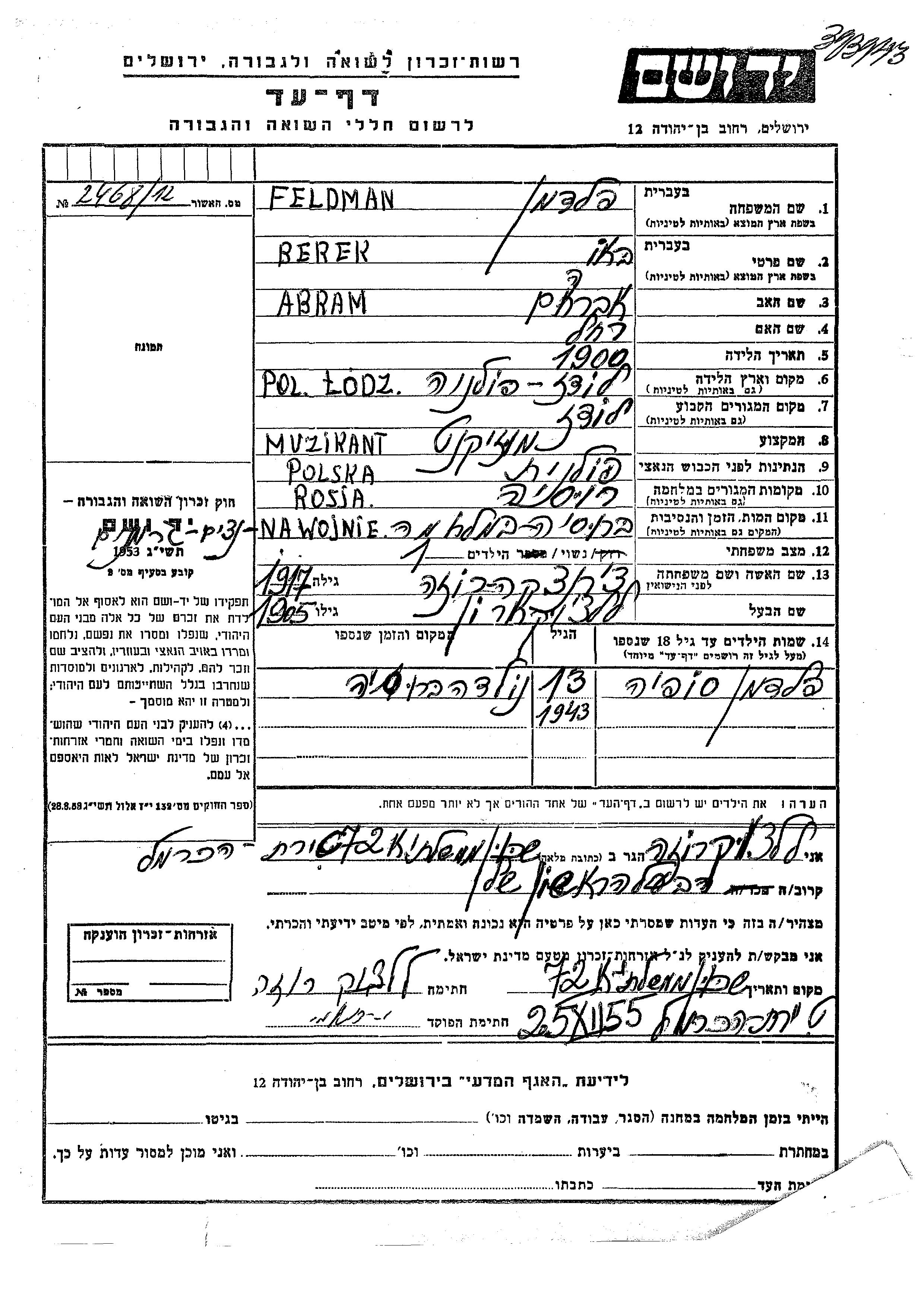 Sofia Feldman wurde Sie war die Tochter von Berek Bau und Roza, geb. Charnechake. Sie war Kind. Vor dem Zweiten Weltkrieg lebte sie in Lodz, Polen. Während des Krieges war sie in Russland (UdSSR).