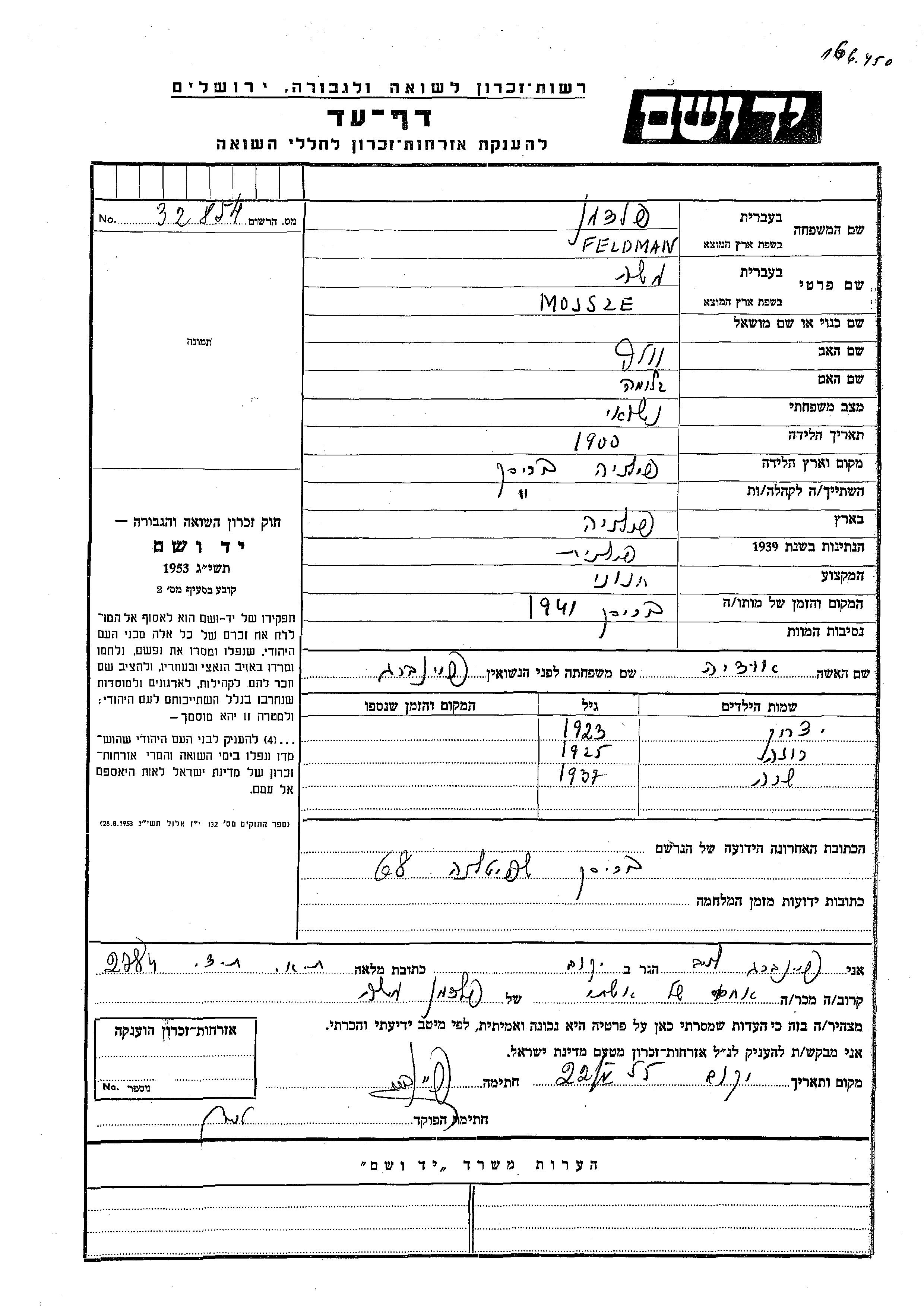 Feldman Sara 1937 Brzesc, Polen Gedenkblatt
