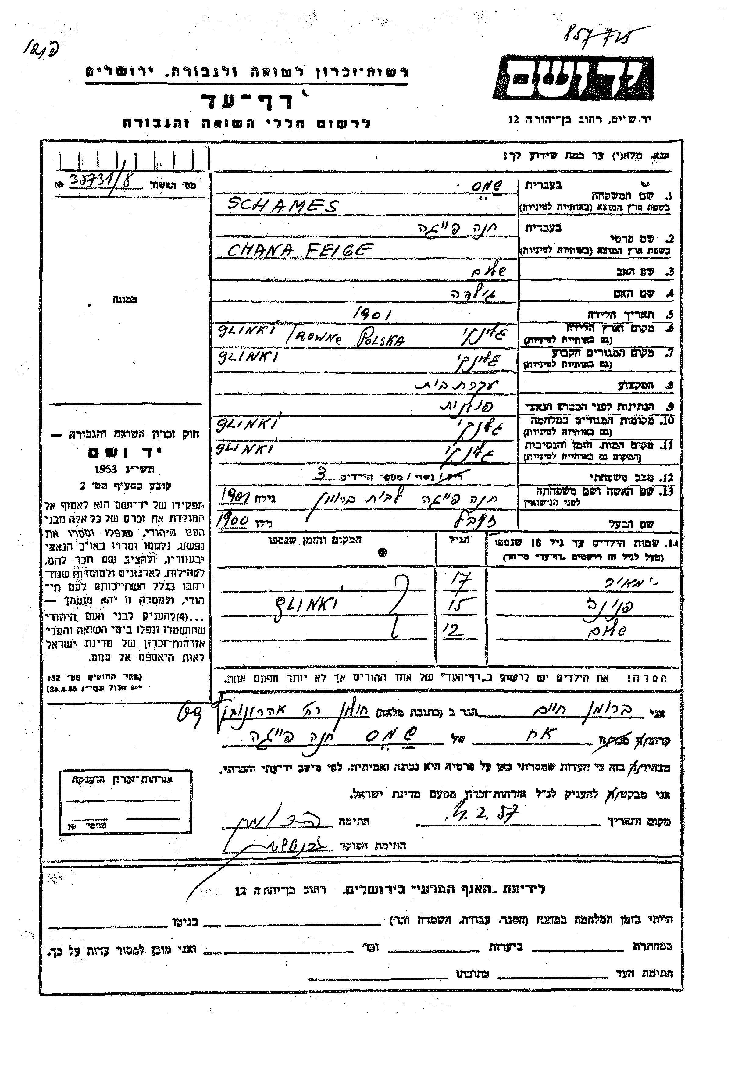 Meir Schames wurde Er war der Sohn von Zanvel und Chana Feiga, geb. Bruman. Er war Kind. Vor dem Zweiten Weltkrieg lebte er in Glinki, Polen. Während des Krieges war er in Glinki, Polen.