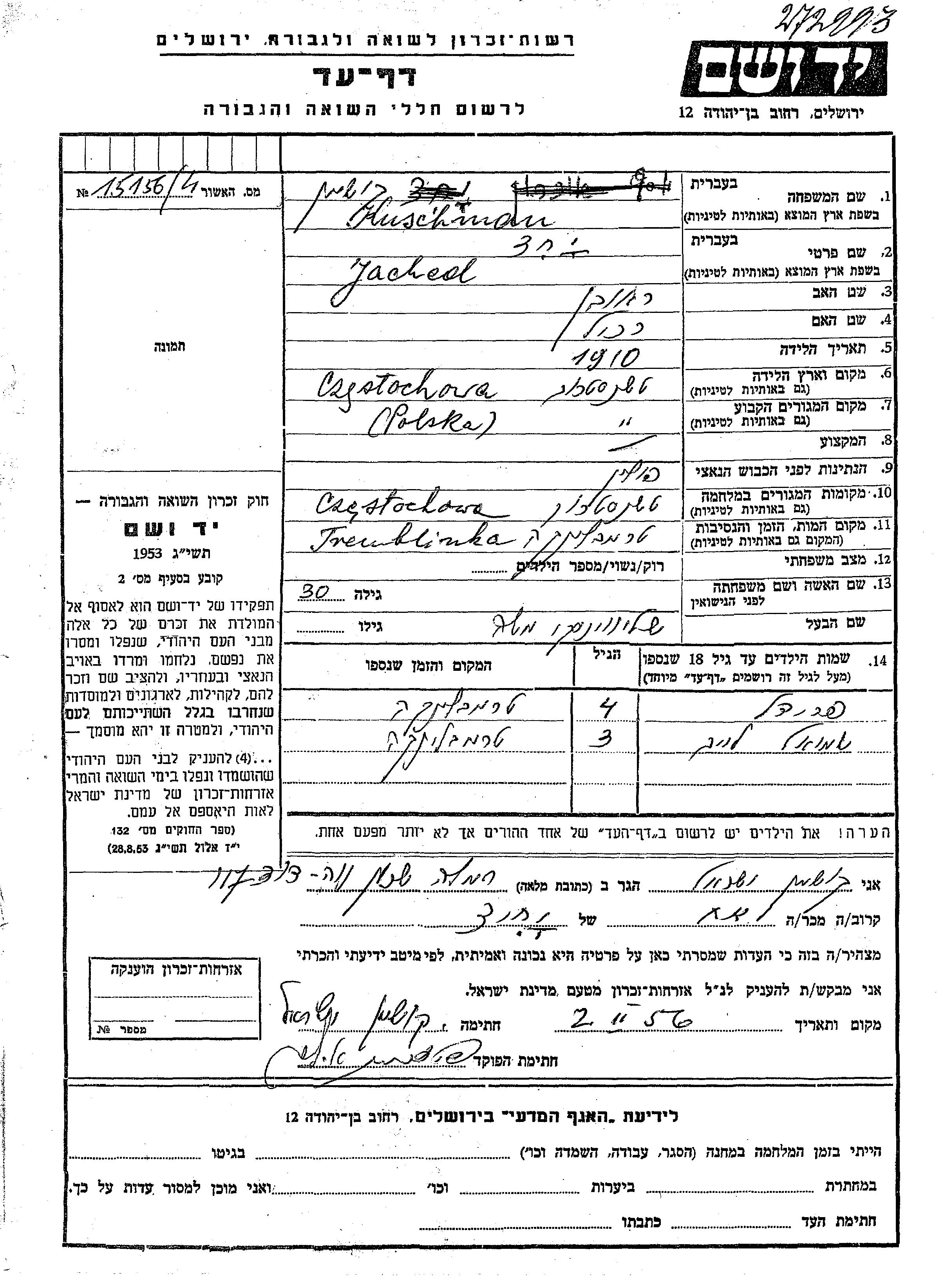Shmuel Leib Shlivinski wurde Er war der Sohn von Moshe und Yached, geb. Kuschman. Er war Kind. Vor dem Zweiten Weltkrieg lebte er in Czestochowa, Polen. Während des Krieges war er in Czestochowa, Polen.