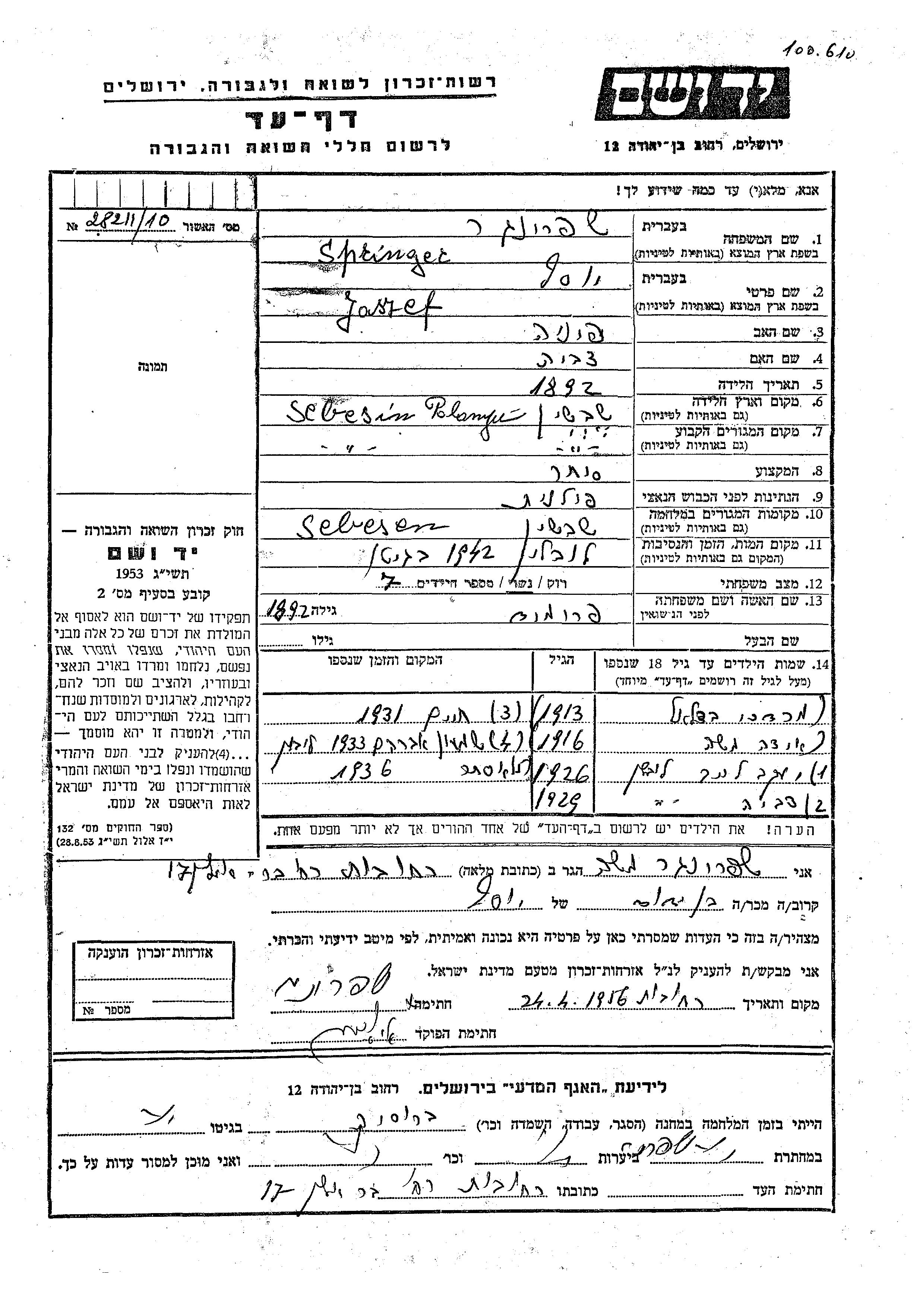 Khaim Springer wurde im Jahr 1931 geboren. Er war der Sohn von Joszef und Frumet. Er war Kind. Vor dem Zweiten Weltkrieg lebte er in Sebesin, Polen. Während des Krieges war er in Sebesin, Polen.