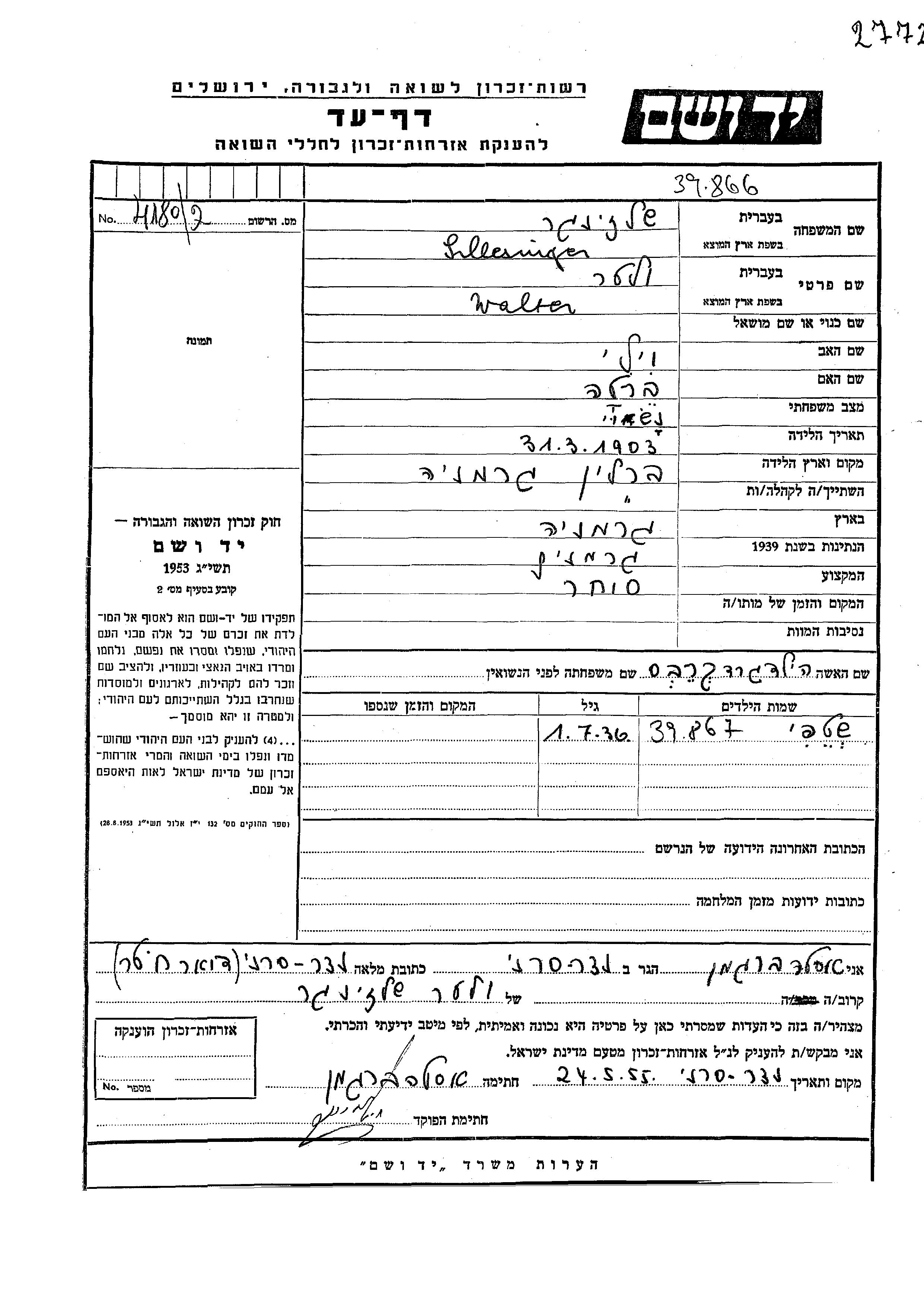Schlesinger Stefania 1936 Berlin, Deutsches Reich Gedenkblatt