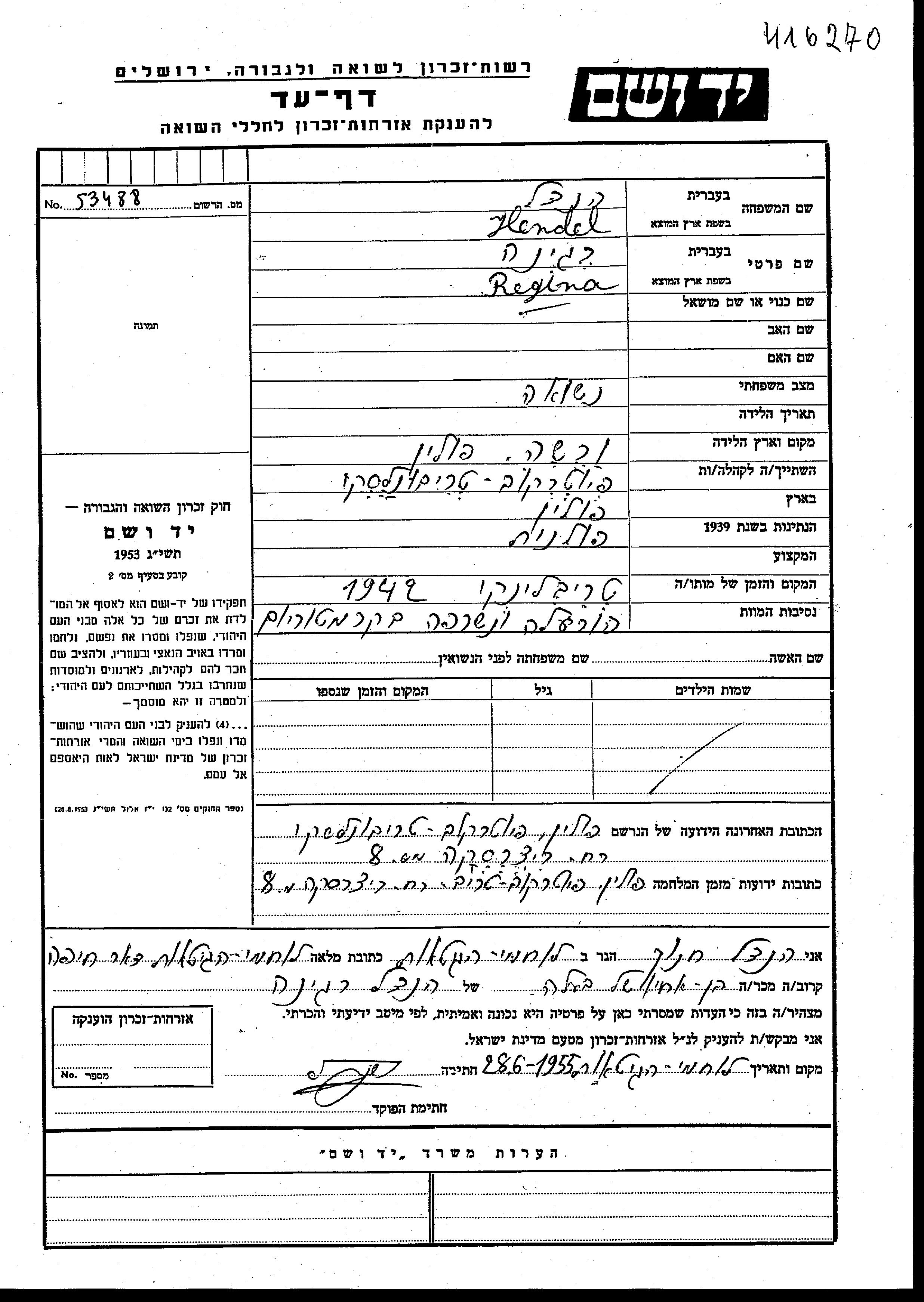 Regina wurde in der Schoah ermordet. Todesort: Treblinka I, Polen im Jahr 1942.