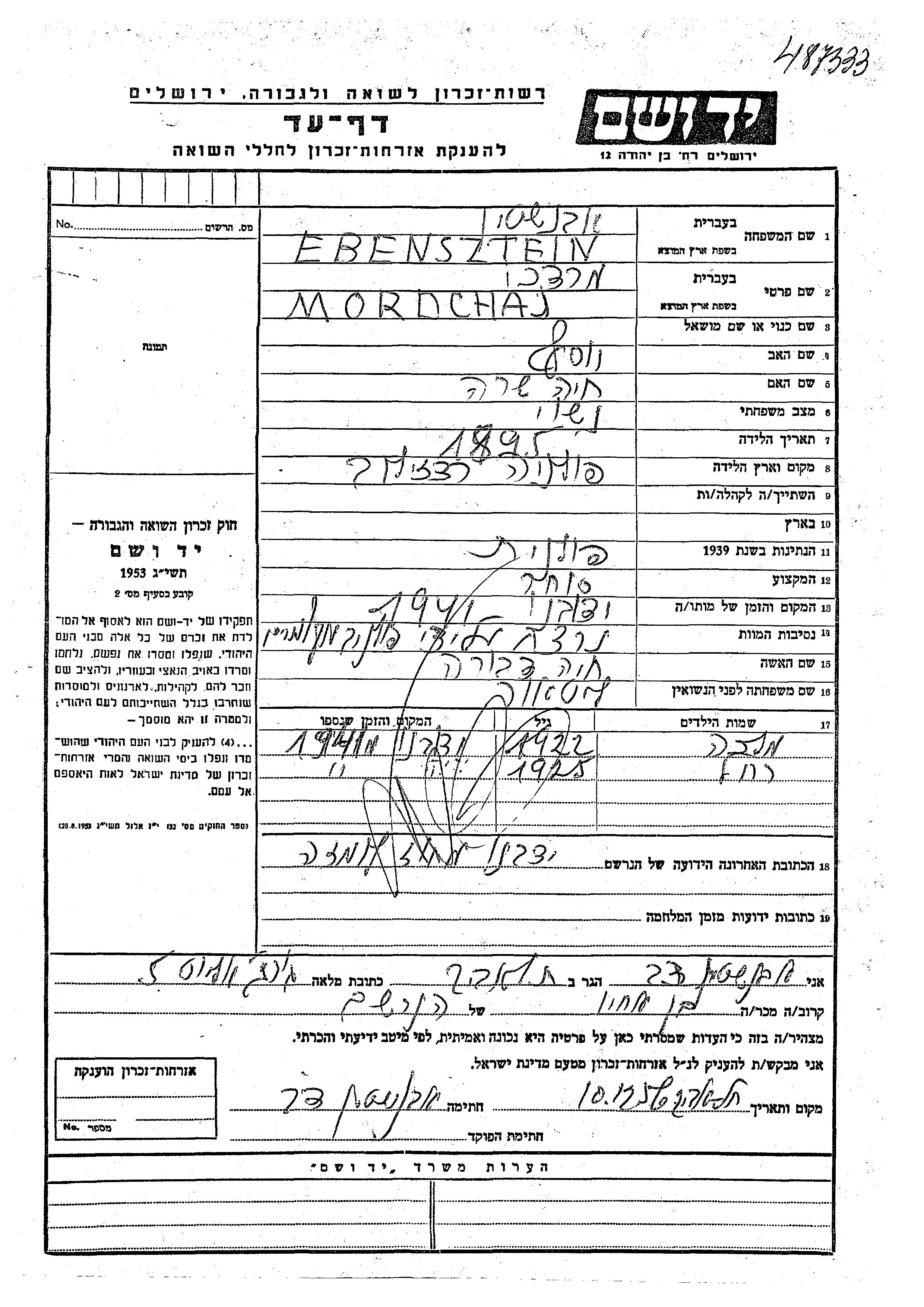 Rakhel Ebensztein wurde im Jahr 1925 geboren. Sie war die Tochter von Mordchaj und Khaia Dvora, geb. Litauer. Sie war Kind.