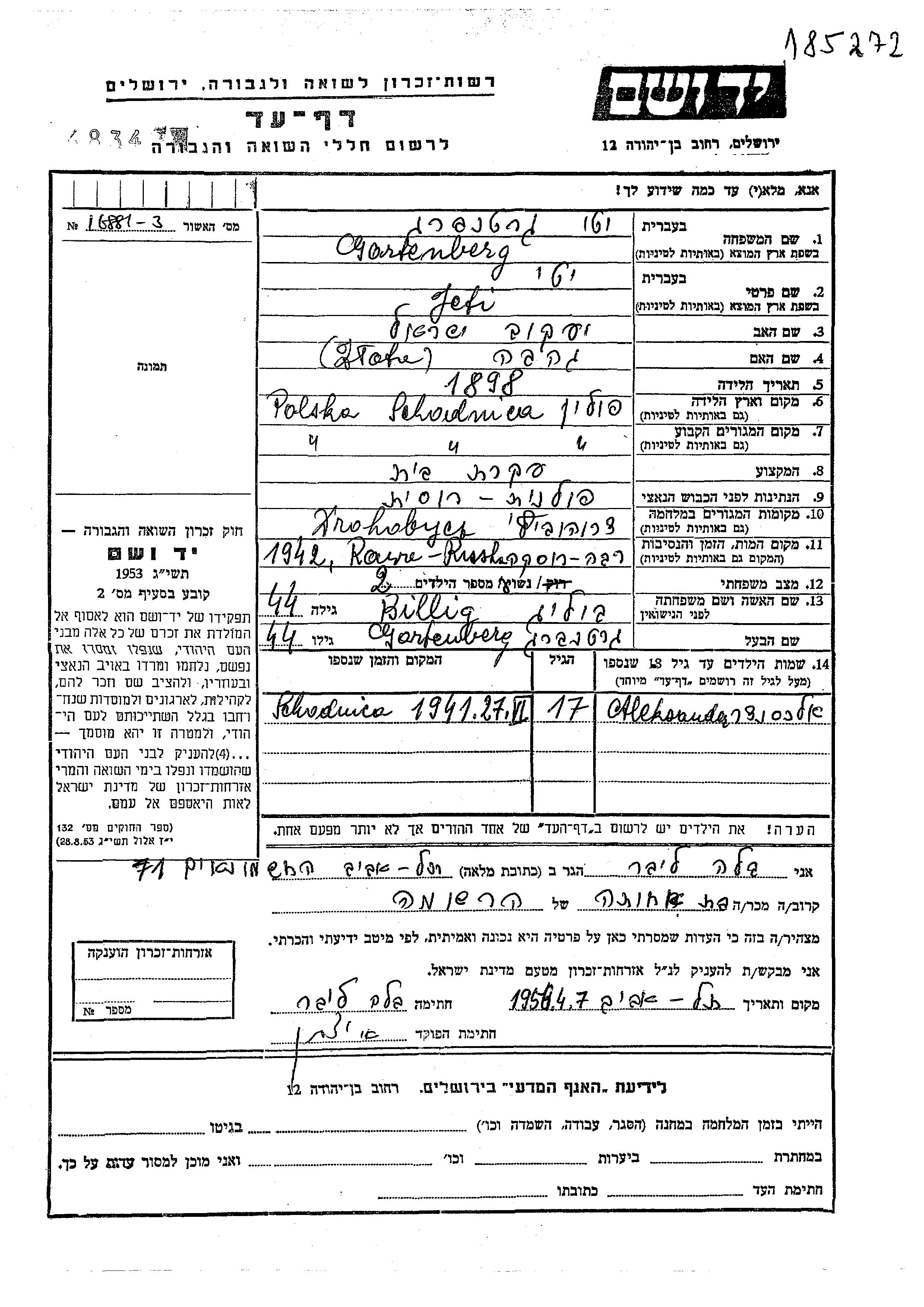 Aleksandar Gartenberg wurde Er war der Sohn von Yeti, geb. Billig. Er war Kind. Vor dem Zweiten Weltkrieg lebte er in Polochany, Polen. Während des Krieges war er in Drohobycz, Polen.