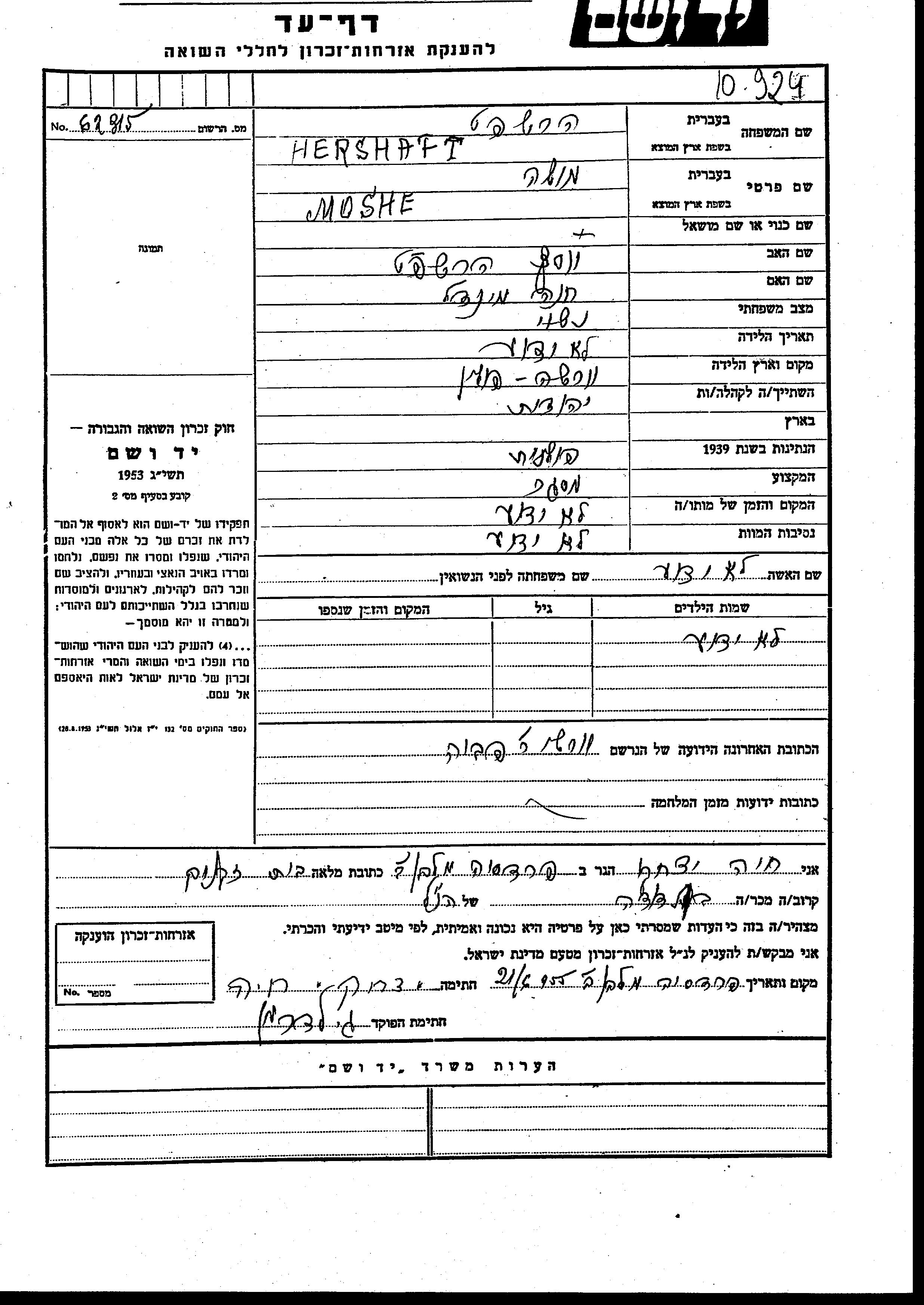 Moshe Hershaft wurde in Warsaw, Polen geboren. Er war der Sohn von Yosef und Khana Mindl. Er war Schlosser und Verheiratet. Während des Krieges war er in Warsaw, Polen.