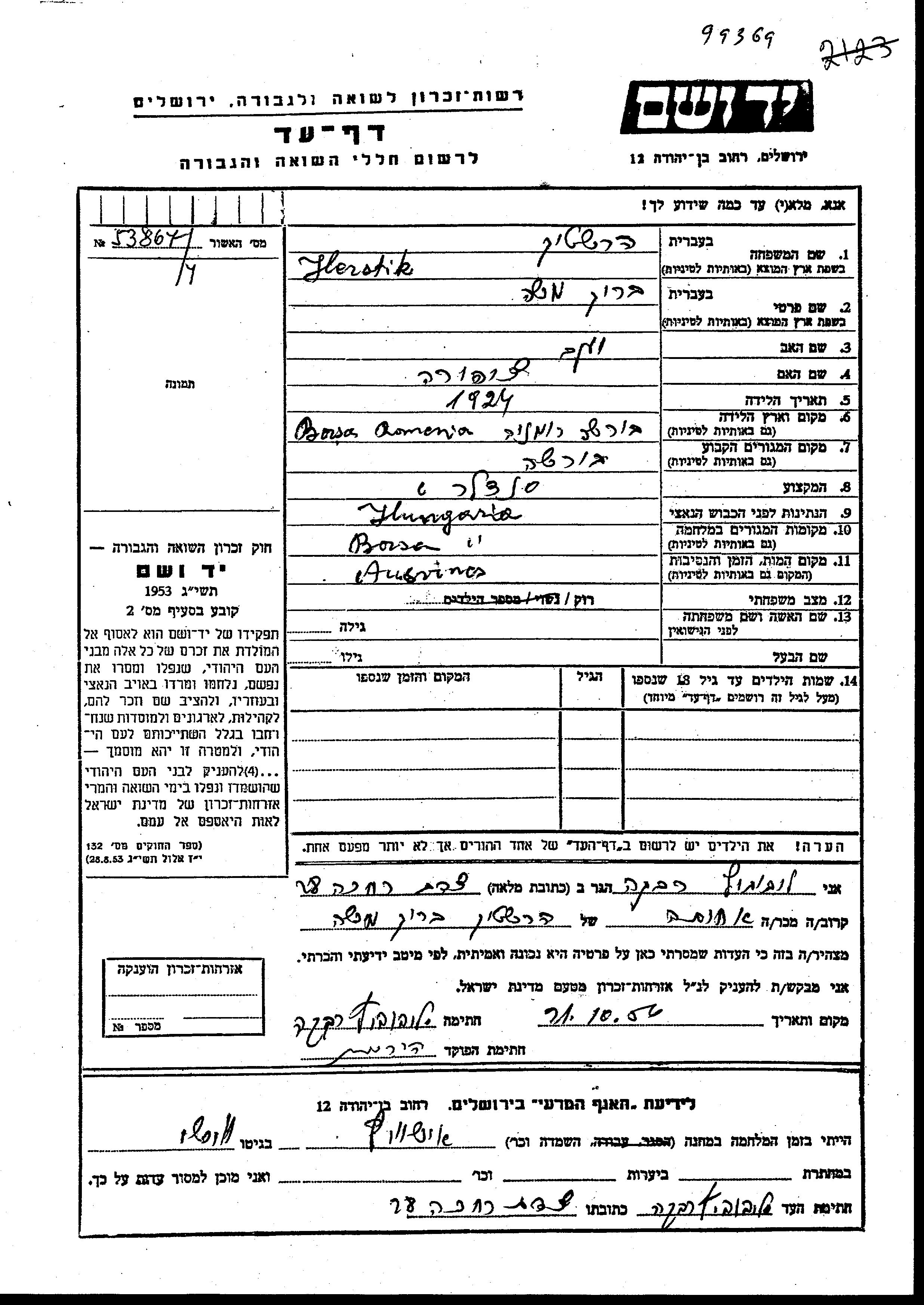Barukh Moshe Hershtik wurde im Jahr 1924 in Borsa, Rumänien geboren. Er war der Sohn von Yaakov und Tzipora. Er war Schuster/-in und Ledig. Vor dem Zweiten Weltkrieg lebte er in Borsa, Rumänien. Während des Krieges war er in Borsa, Rumänien.