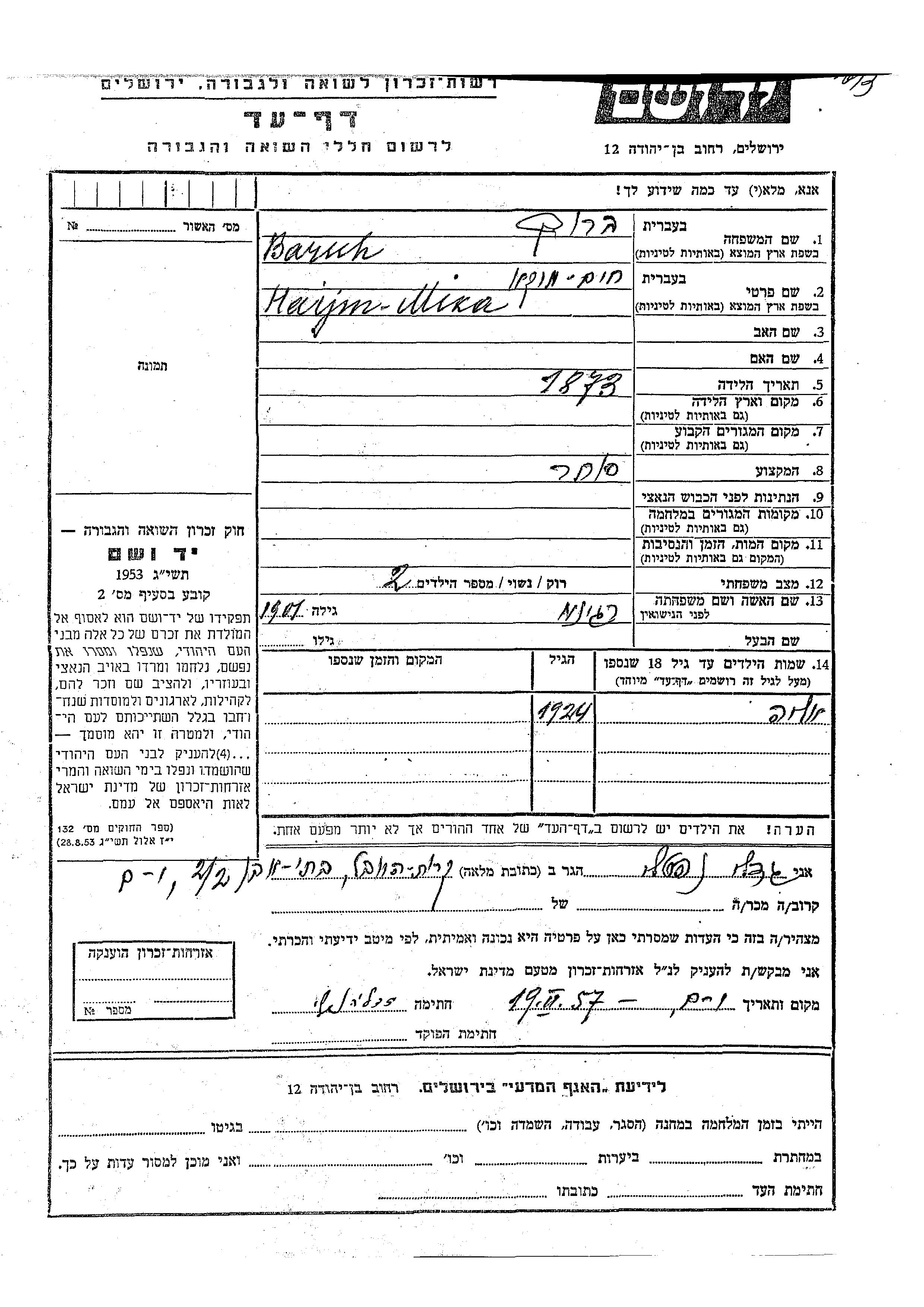 Alia Baruh wurde im Jahr 1924 geboren. Er/sie war der/ die Sohn/Tochter von Haijm Mika und Regina. Er/Sie war Kind.