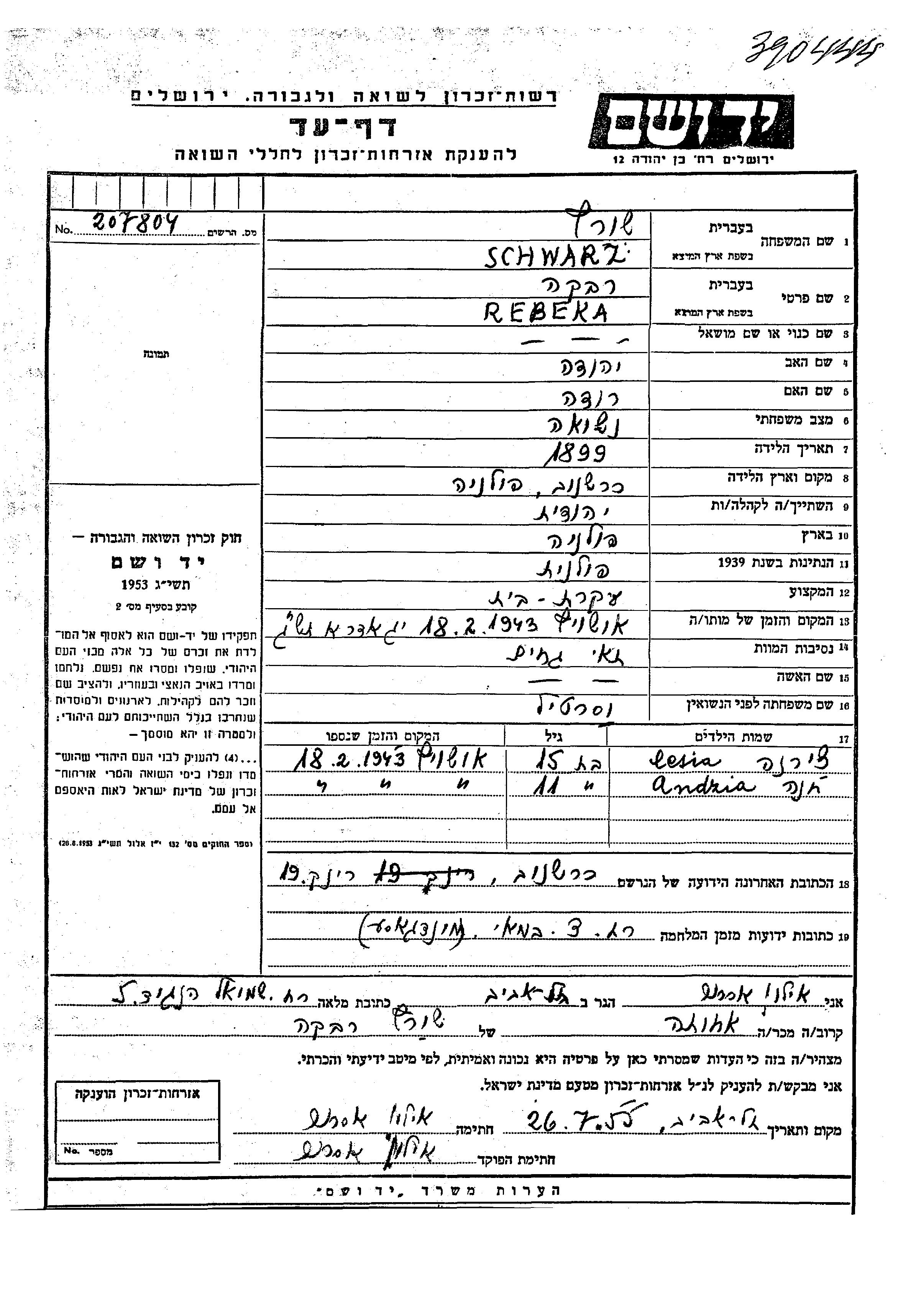 Andria Khana Schwarz wurde Sie war die Tochter von Rebeka, geb. Vaserteil. Sie war Kind. Vor dem Zweiten Weltkrieg lebte sie in Polen. Während des Krieges war sie in Krashanov, Polen.