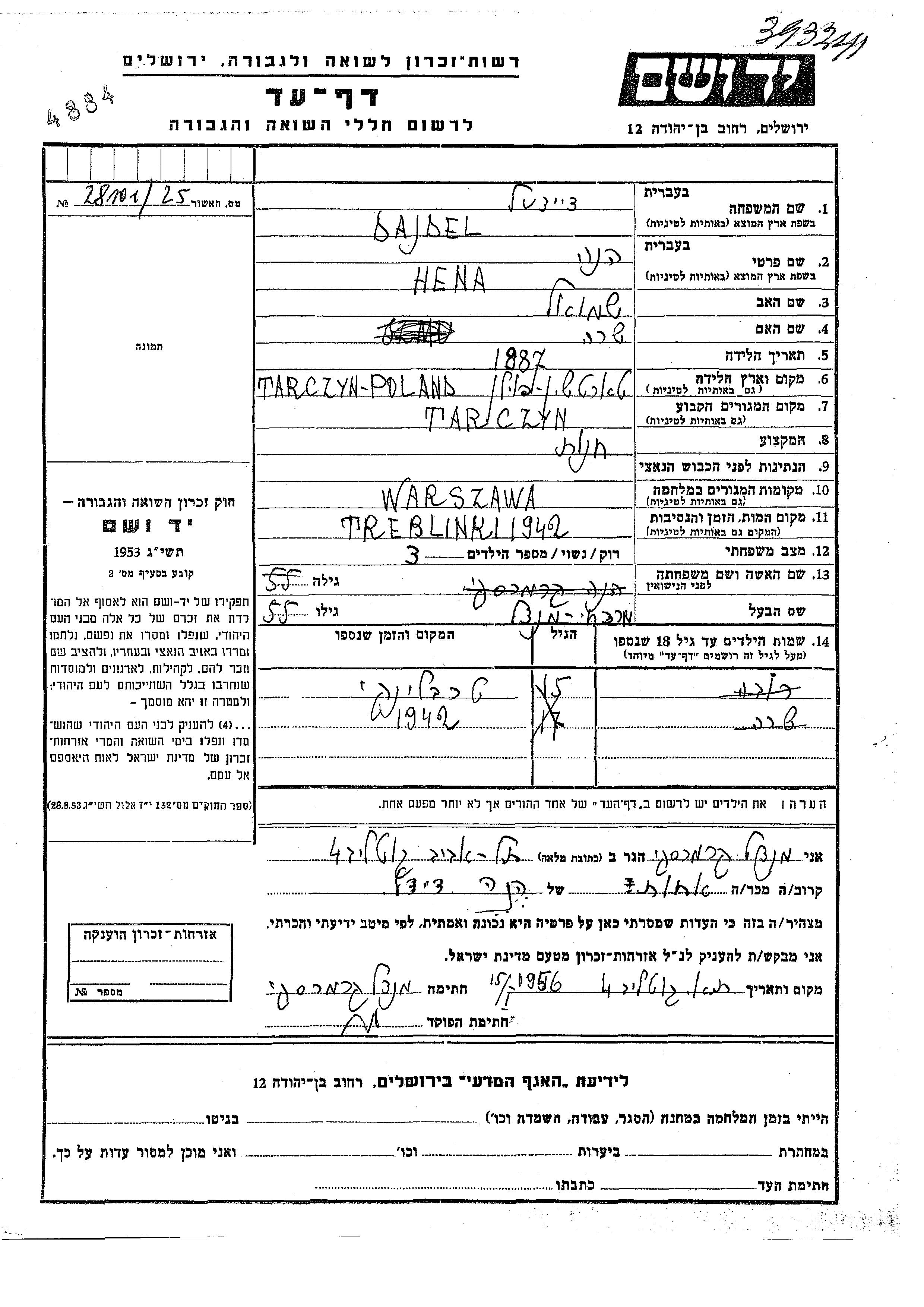 Ruva Dajdel wurde Er/sie war der/ die Sohn/Tochter von Mordekhai Mendel und Hena, geb. Kramarski. Er/Sie war Kind. Vor dem Zweiten Weltkrieg er/sie in Tarczyn, Polen. Während des Krieges war er/sie in Warsaw, Polen.