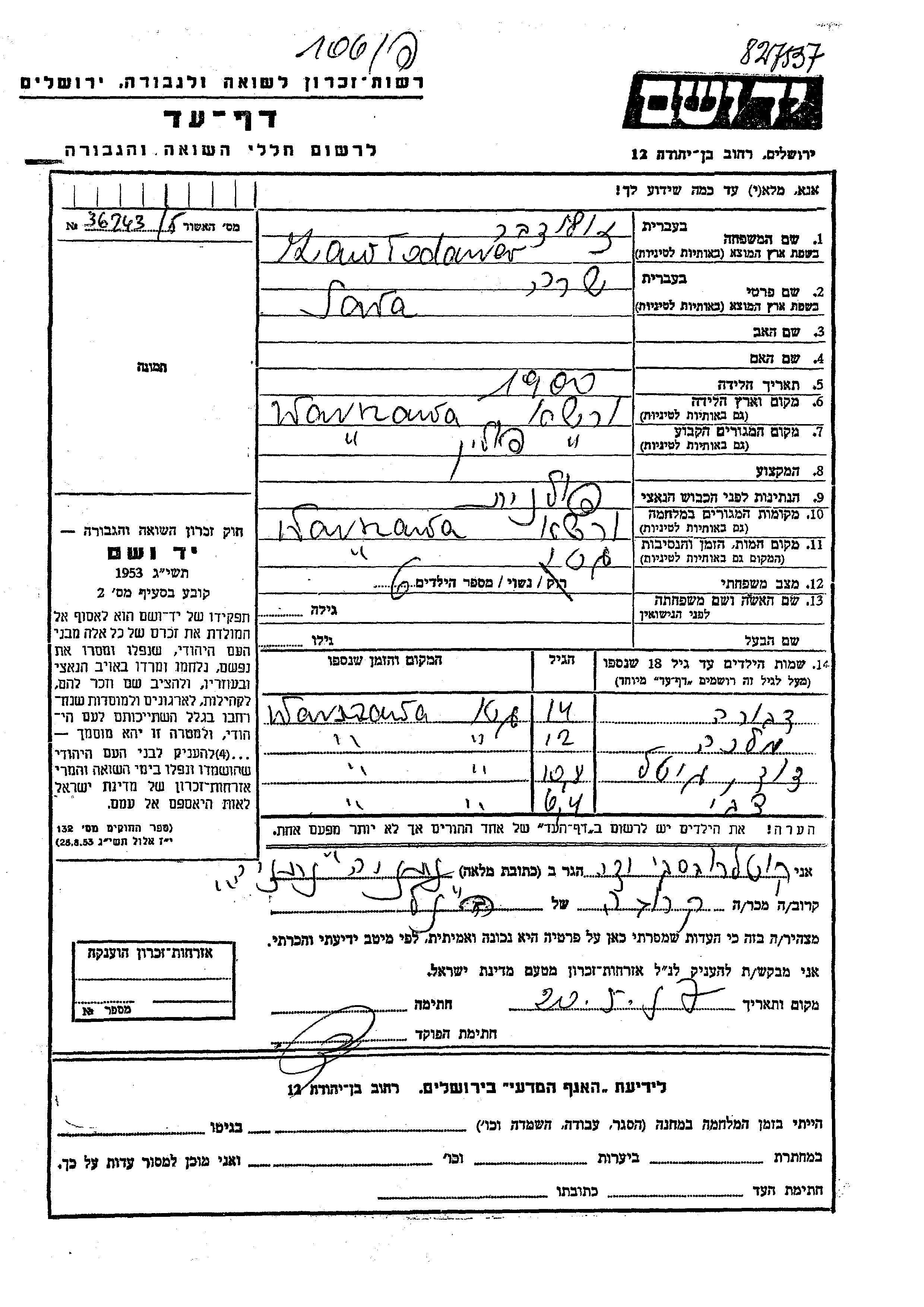 Dvora Zawlodawer wurde Sie war die Tochter von Sara. Sie war Kind. Vor dem Zweiten Weltkrieg lebte sie in Warsaw, Polen. Während des Krieges war sie in Varsha, Polen.