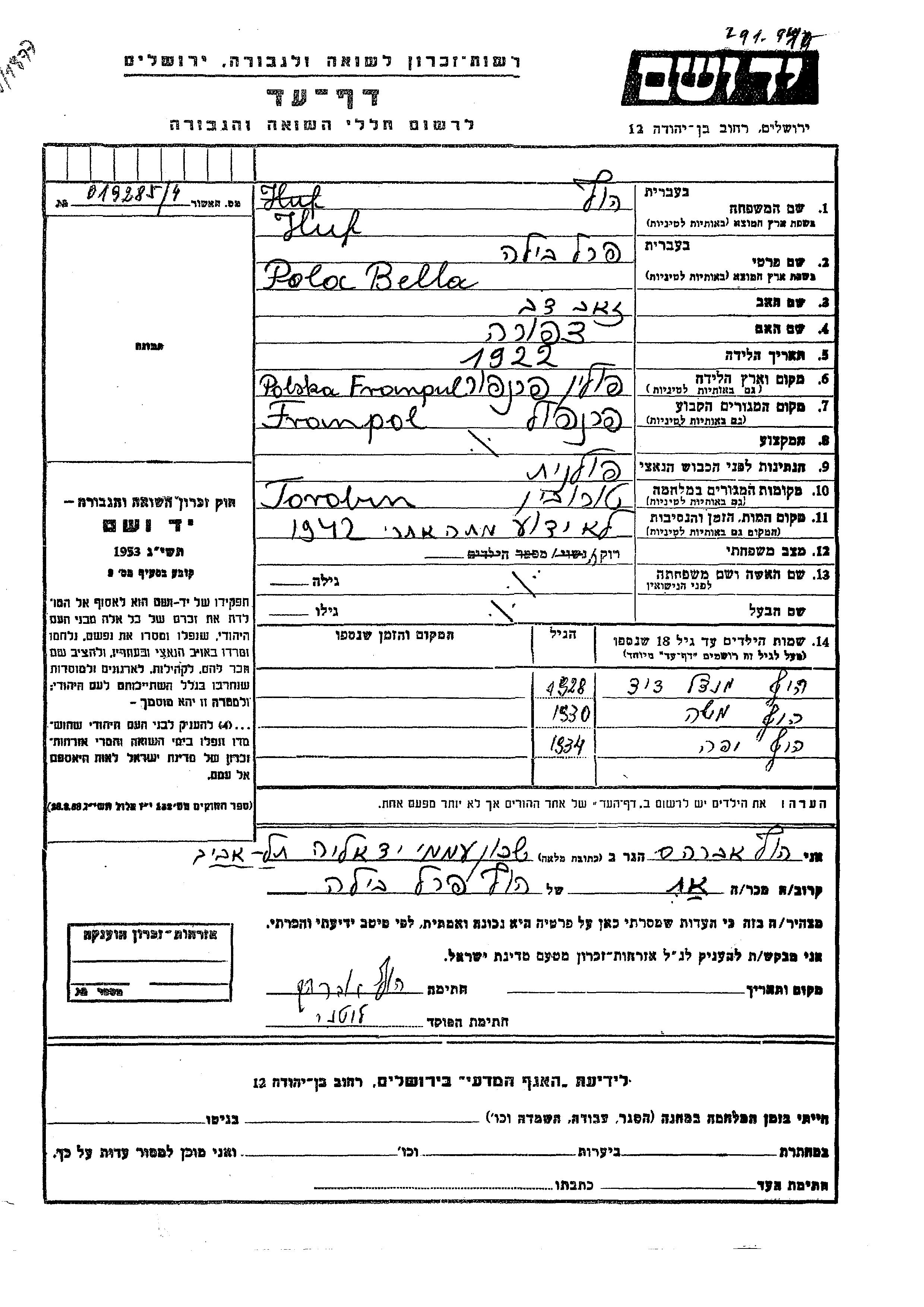 Moshe Huf wurde im Jahr 1930 geboren. Er war der Sohn von Pola Bella Perel. Er war Kind. Vor dem Zweiten Weltkrieg lebte er in Franpol, Polen. Während des Krieges war er in Torobin, Polen.