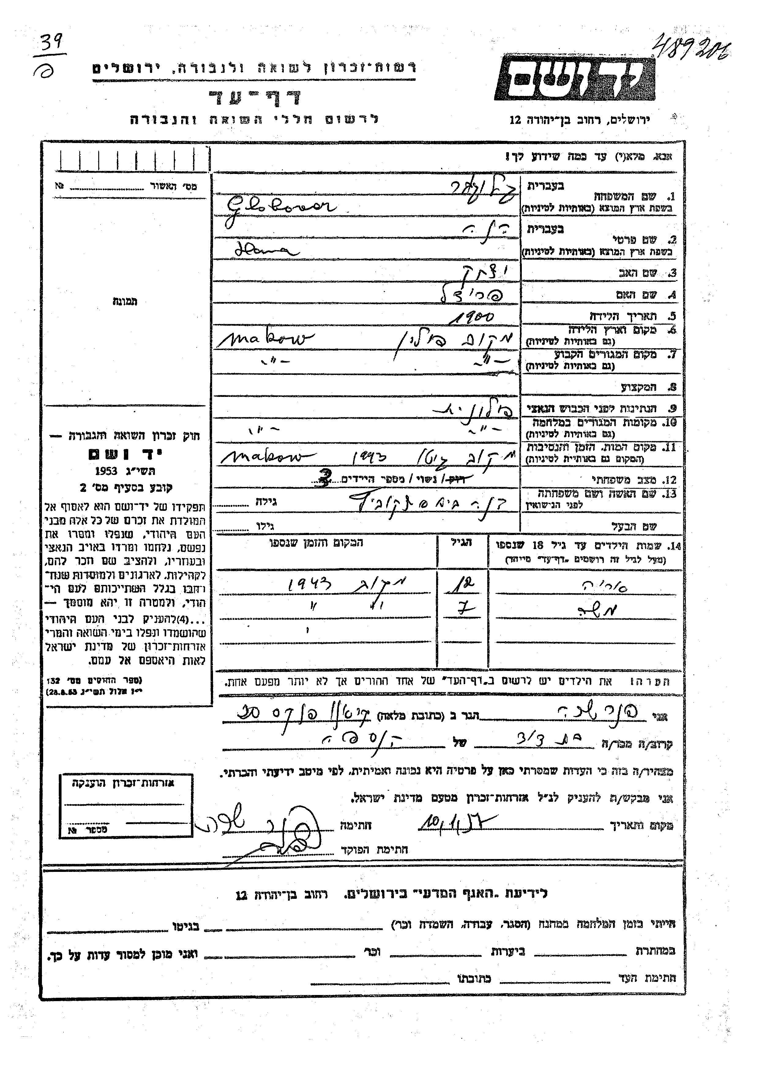 Moshe Globowar wurde Er war der Sohn von Bene und Hana, geb. Itzkovitz. Er war Kind. Vor dem Zweiten Weltkrieg lebte er in Makow, Polen. Während des Krieges war er in Makow, Polen.