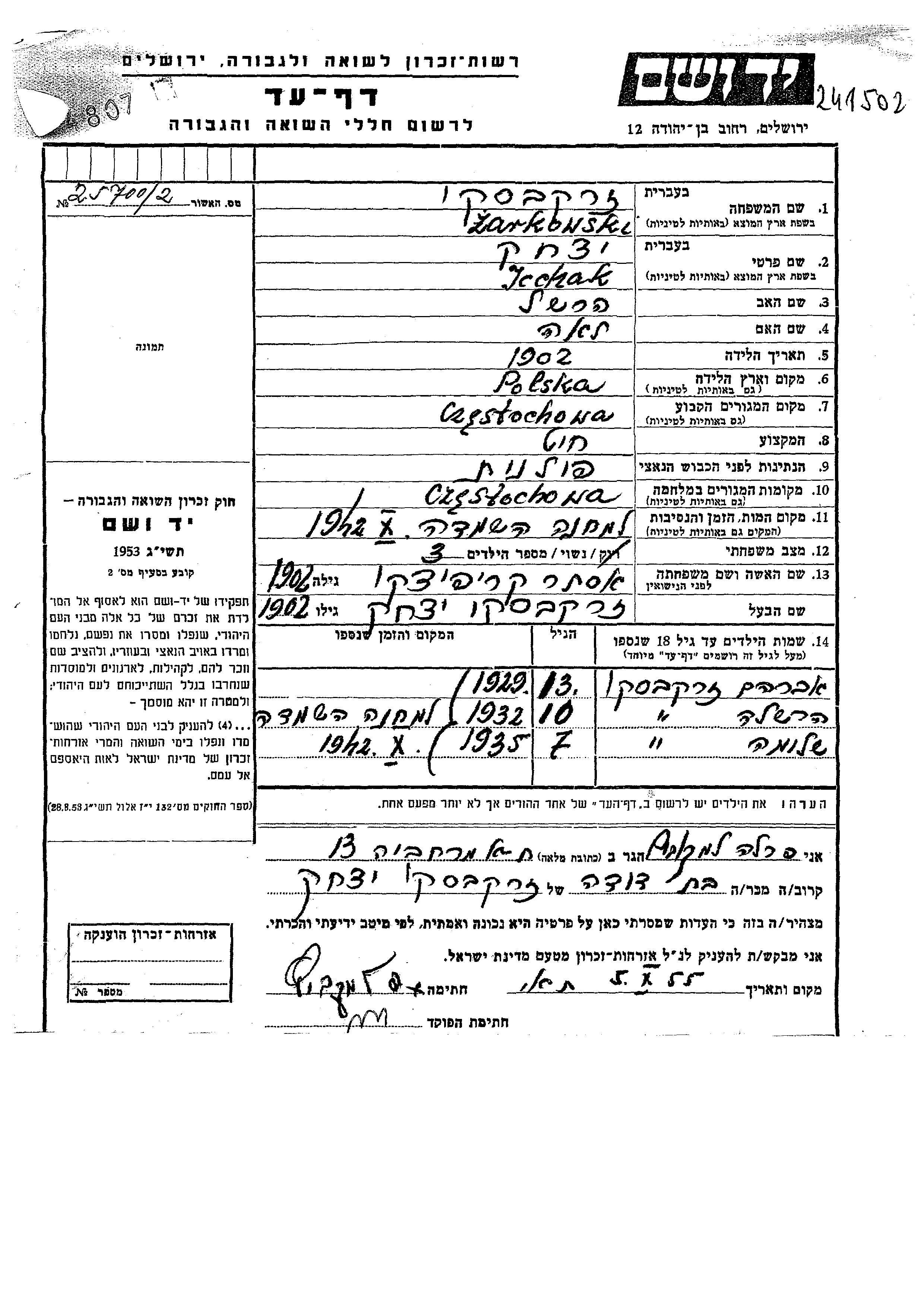 Hershele Zarkowski wurde im Jahr 1932 geboren. Er war der Sohn von Jcchak und Ester, geb. Kripitzko. Er war Kind. Vor dem Zweiten Weltkrieg lebte er in Czestochowa, Polen. Während des Krieges war er in Czestochowa, Polen.