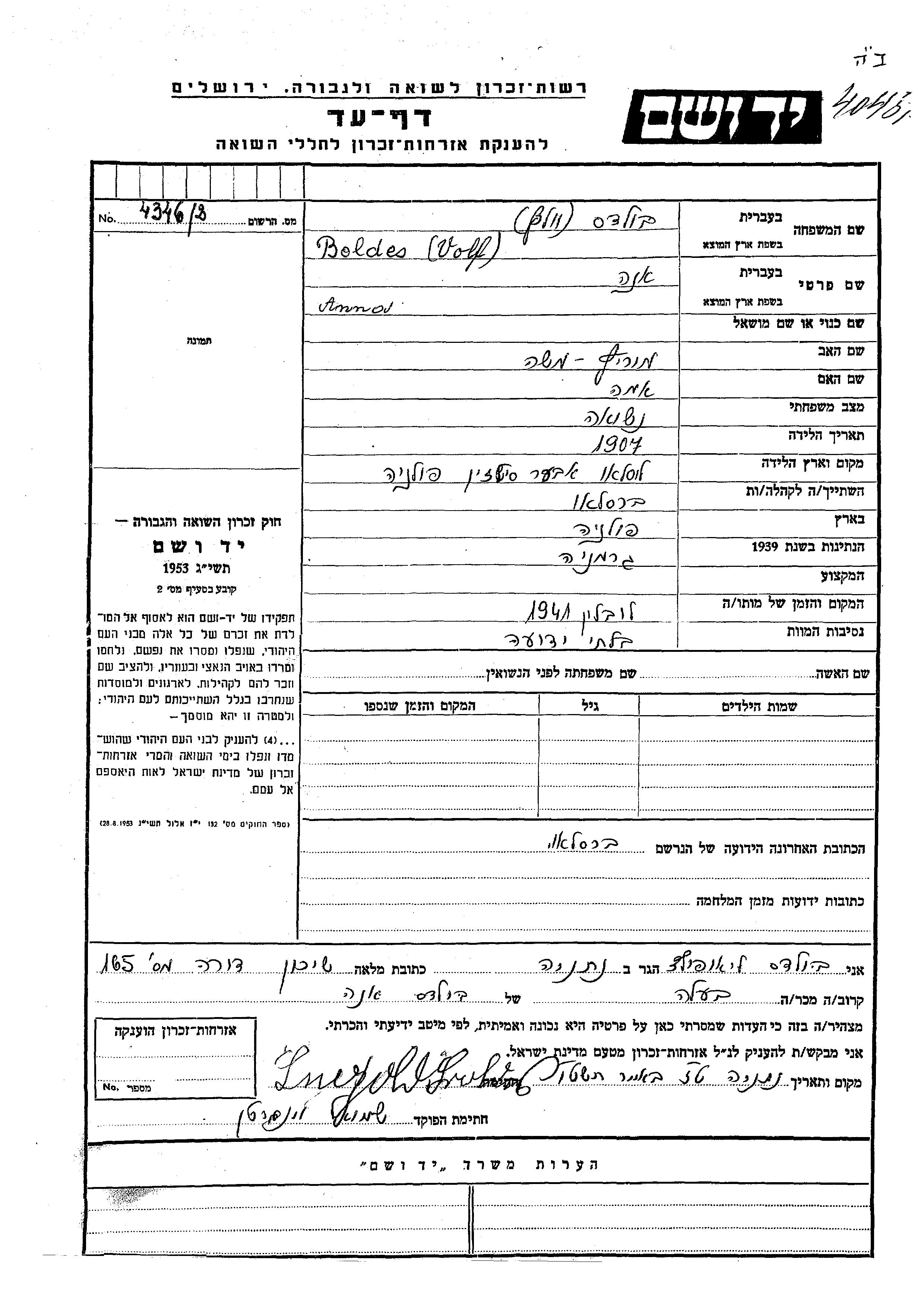 Anna Boldes Volf, geb. Volf wurde im Jahr 1907 in Leslau, Polen geboren. Sie war die Tochter von Moritz Moshe und Ema. Sie war Verheiratet. Vor dem Zweiten Weltkrieg lebte sie in Breslau, Deutsches Reich. Während des Krieges war sie in Breslau, Deutsches Reich.