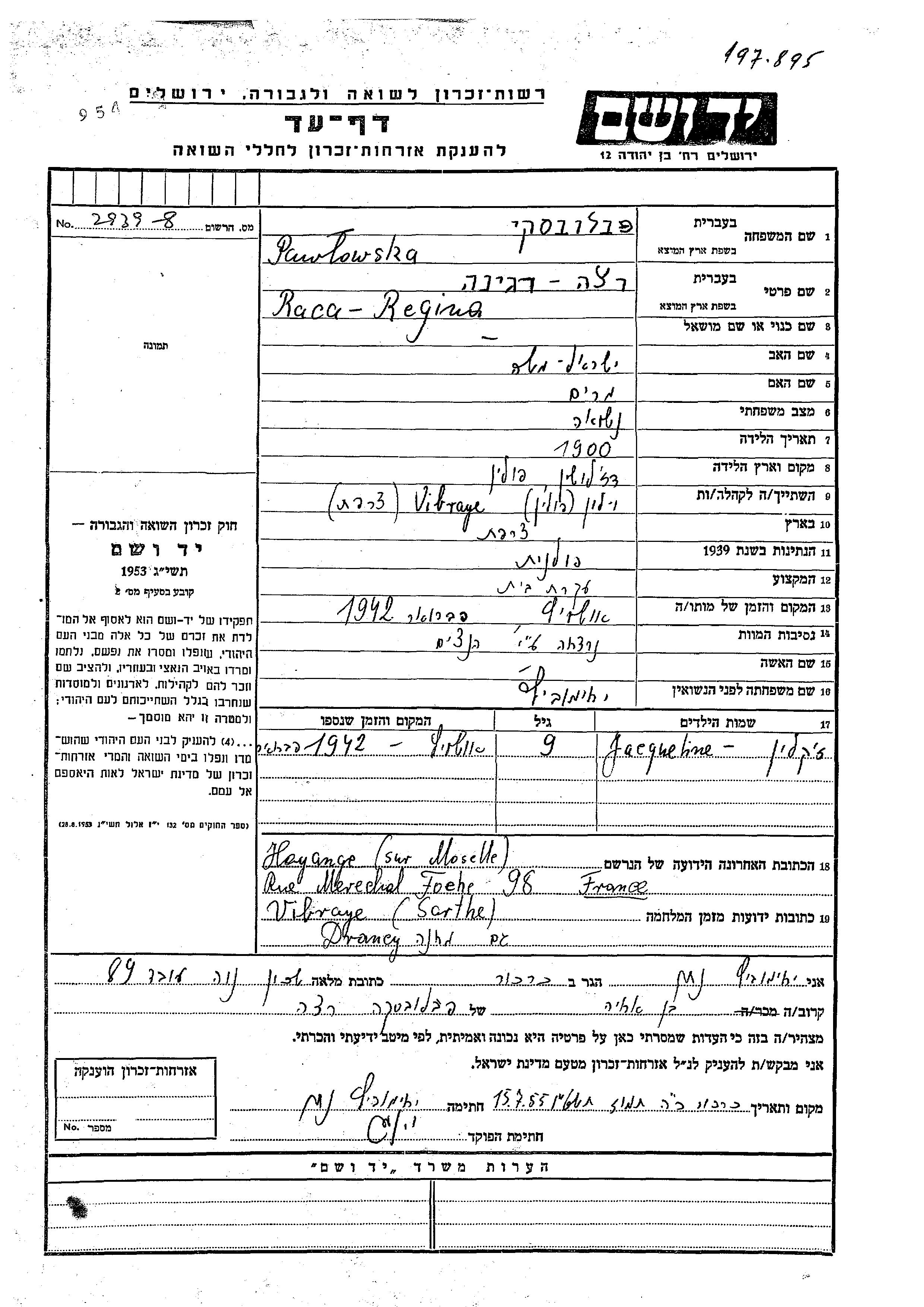 Jacqueline Pawlowska wurde Sie war die Tochter von Raca Regina, geb. Iakhimovitz. Sie war Kind. Vor dem Zweiten Weltkrieg lebte sie in Wielun, Polen. Während des Krieges war sie in Drancy, Frankreich.