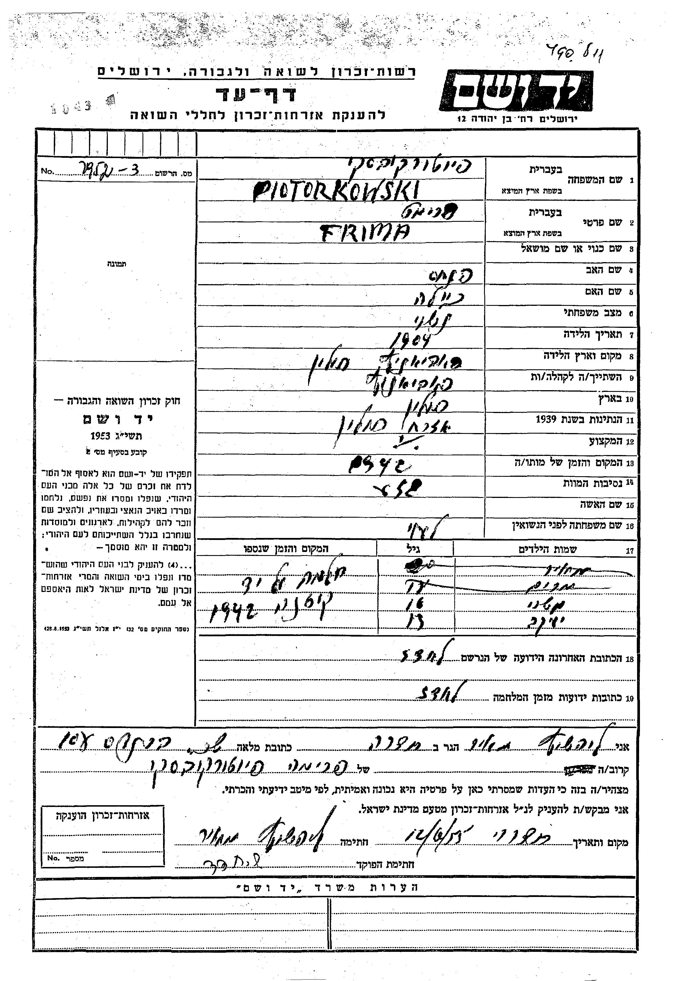 Moshe Piotorkowski wurde Er war der Sohn von Frima, geb. Levi. Er war Kind. Vor dem Zweiten Weltkrieg lebte er in Pabianice, Polen. Während des Krieges war er in Lodz, Polen.
